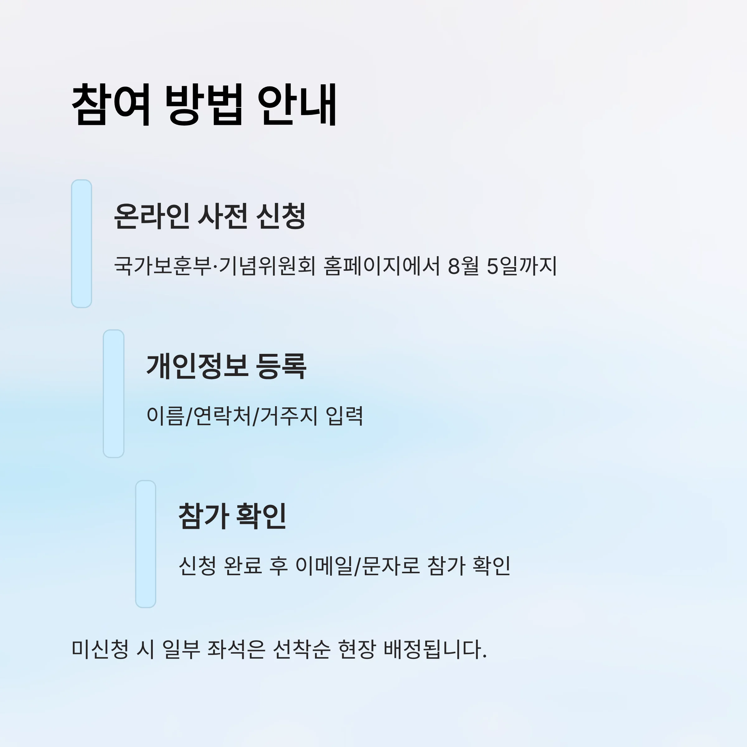 - 중앙 기념식: 국가보훈부·기념위원회 홈페이지에서 온라인 사전 신청