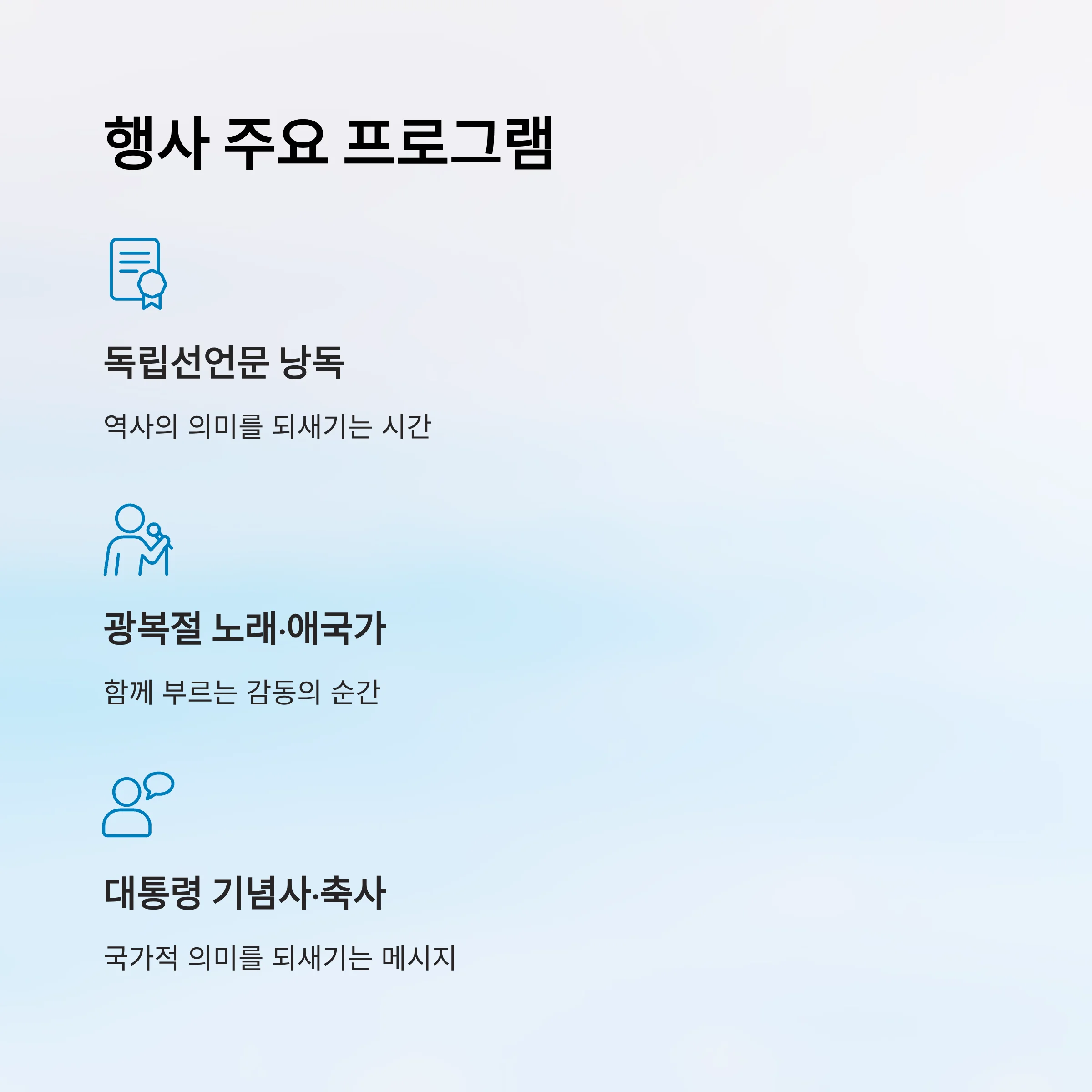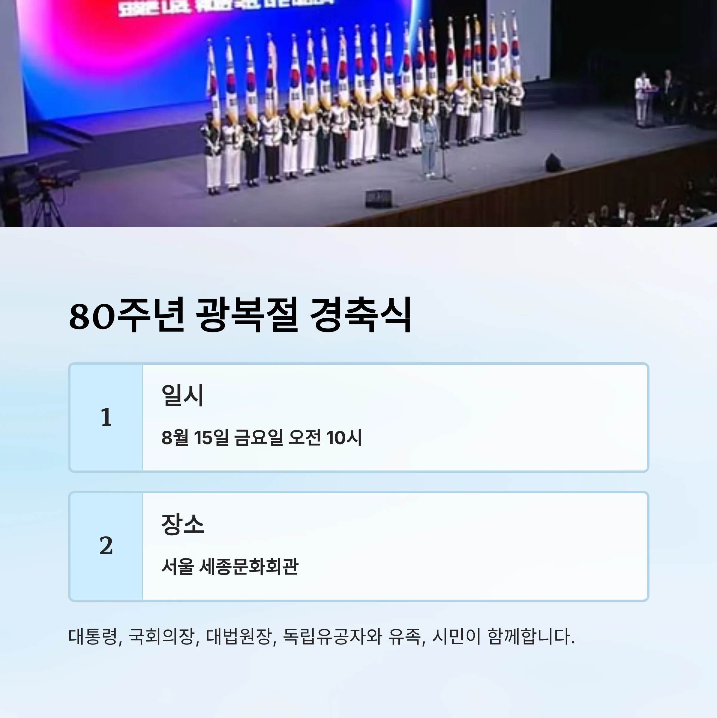 - 참석자: 대통령, 국회의장, 대법원장, 독립유공자·유족, 시민