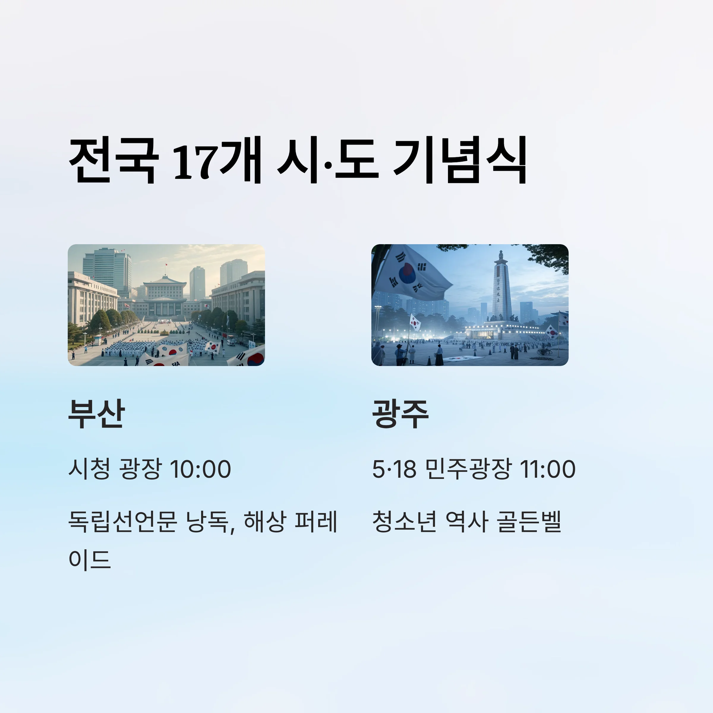 | 부산 | 시청 광장 | 10:00 | 독립선언문 낭독, 해상 퍼레이드 |