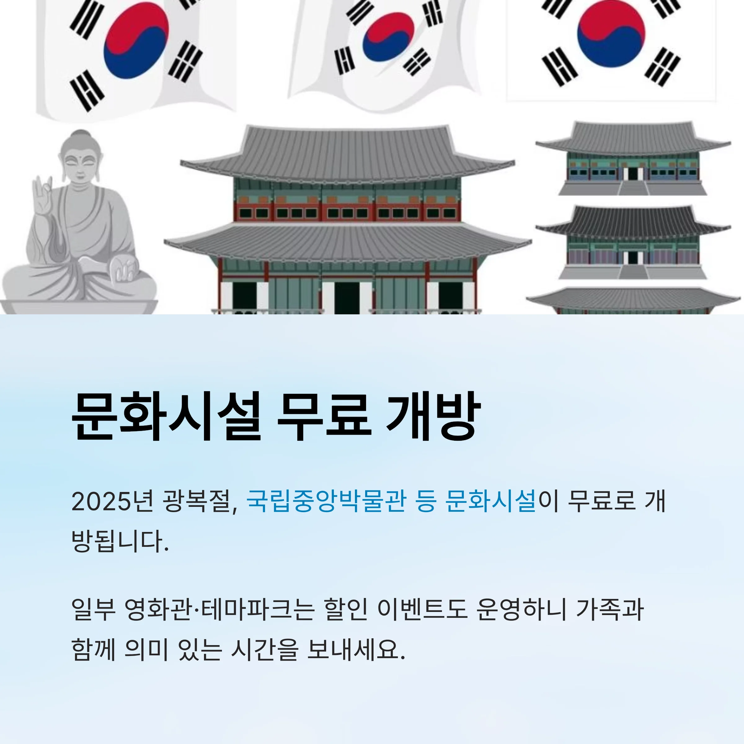 ※ 2025년 광복절, 국립중앙박물관 등 문화시설 무료 개방하며, 일부 영화관·테마파크는 할인 이벤트도 운영합니다.