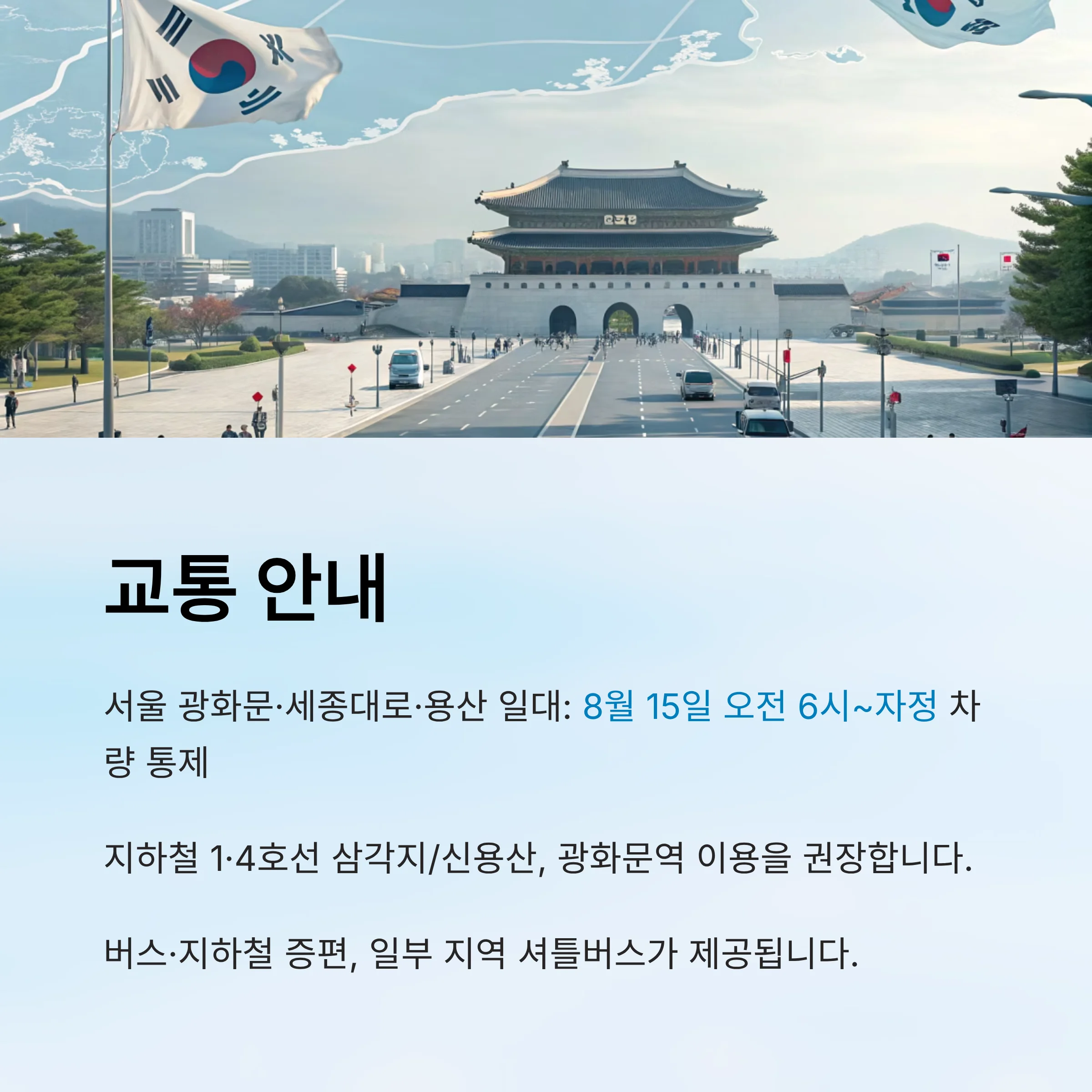 - 서울 광화문·세종대로·용산 일대: 8월15일 오전6시~자정 차량 통제