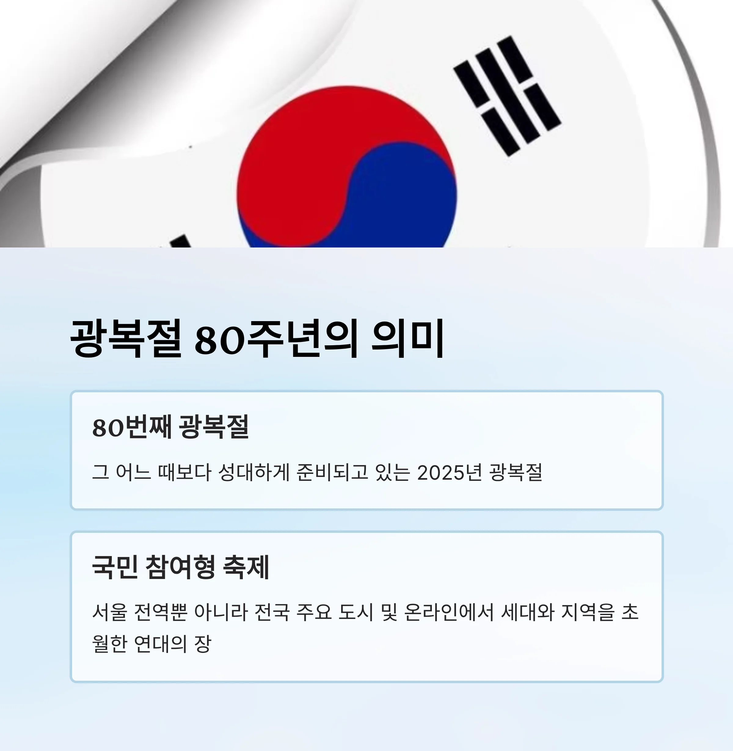 2025년 광복절은 대한민국 80번째 광복절인 만큼, 그 어느 때보다 성대하게 준비되고 있습니다.