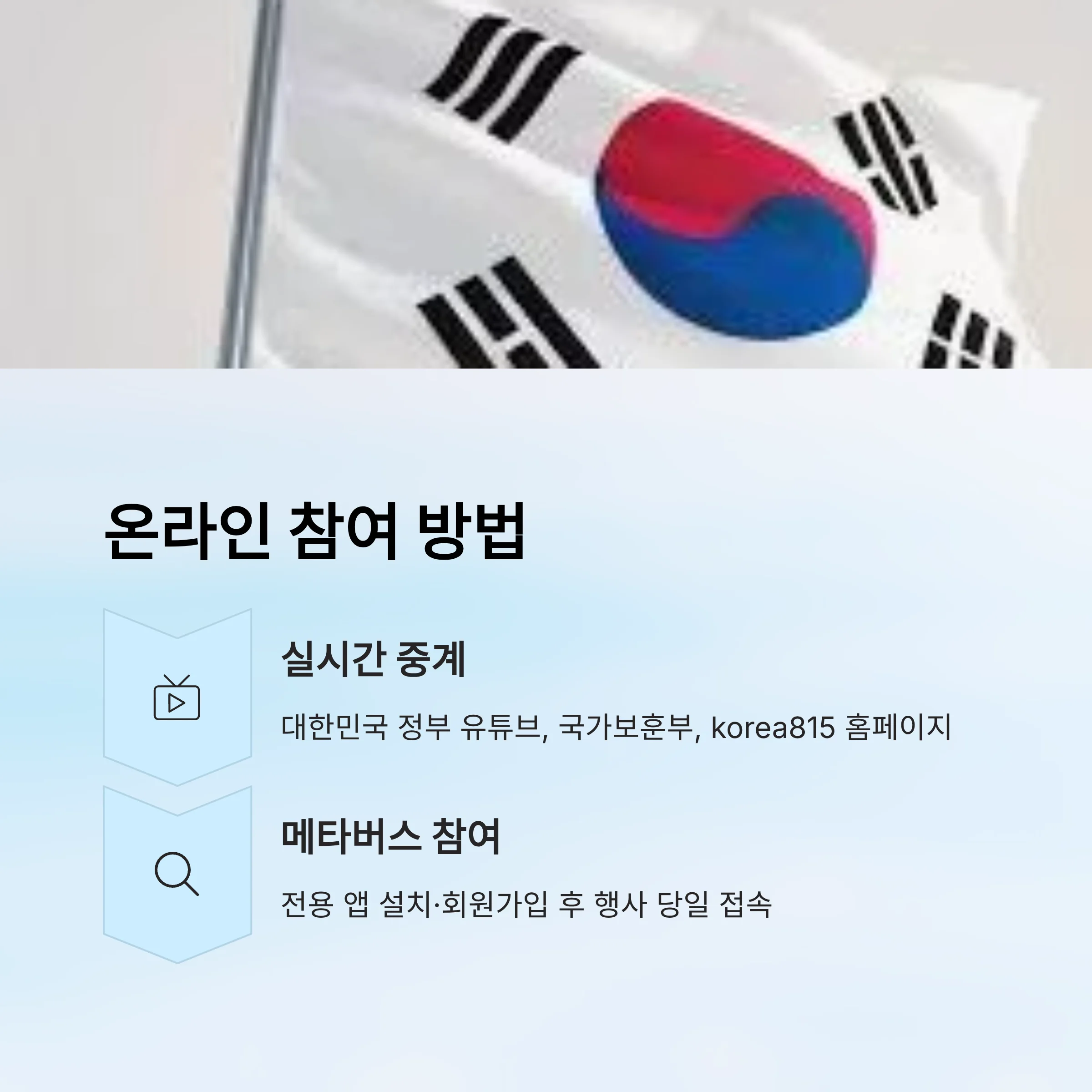 - 온라인 참여: 대한민국 정부 유튜브, 국가보훈부·korea815 홈페이지 실시간 중계