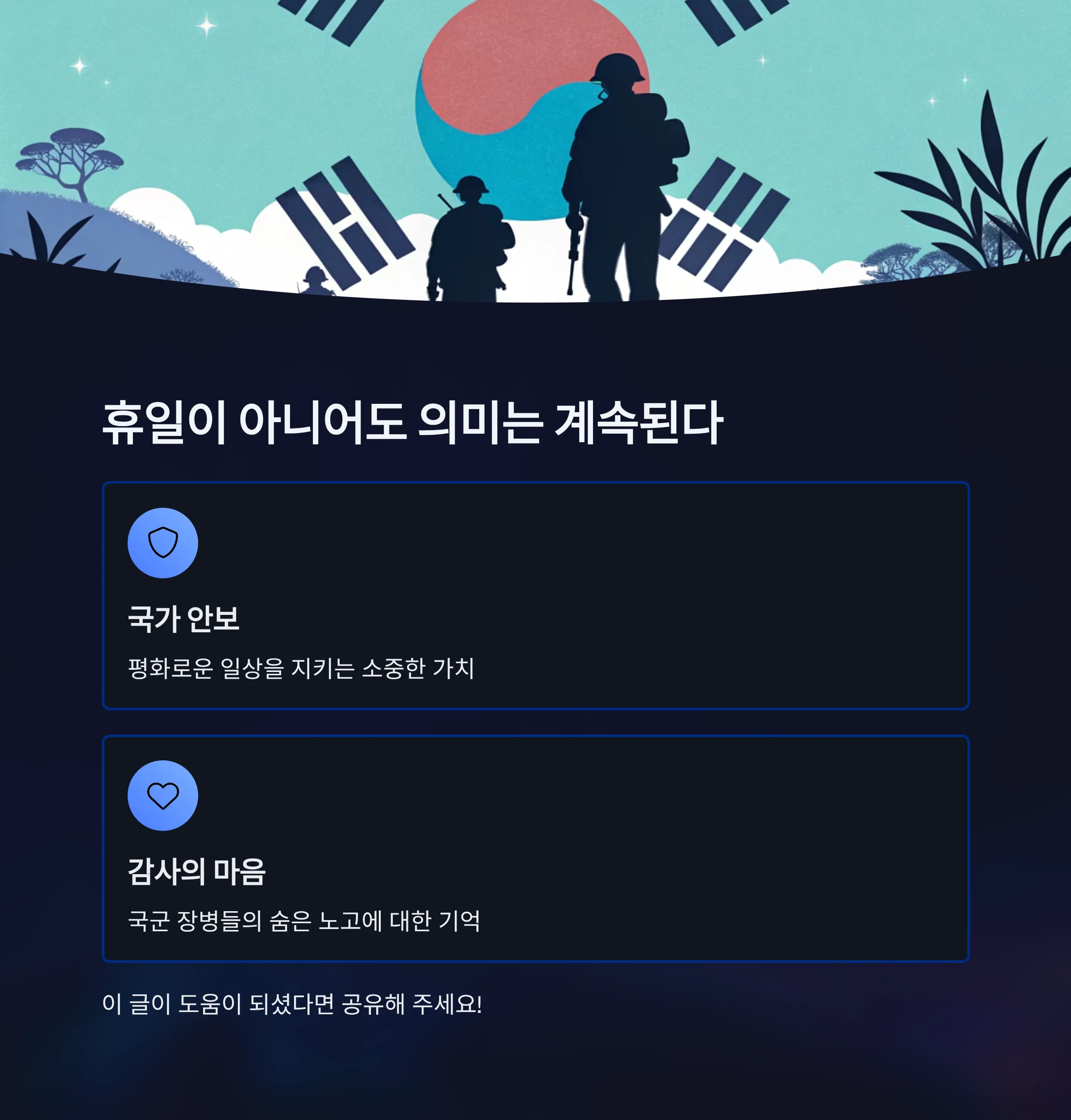 우리 일상의 평화가 국군 장병들의 숨은 노력 덕분임을 기억하며 그 의미를 되새기는 계기가 되어야 하겠습니다.