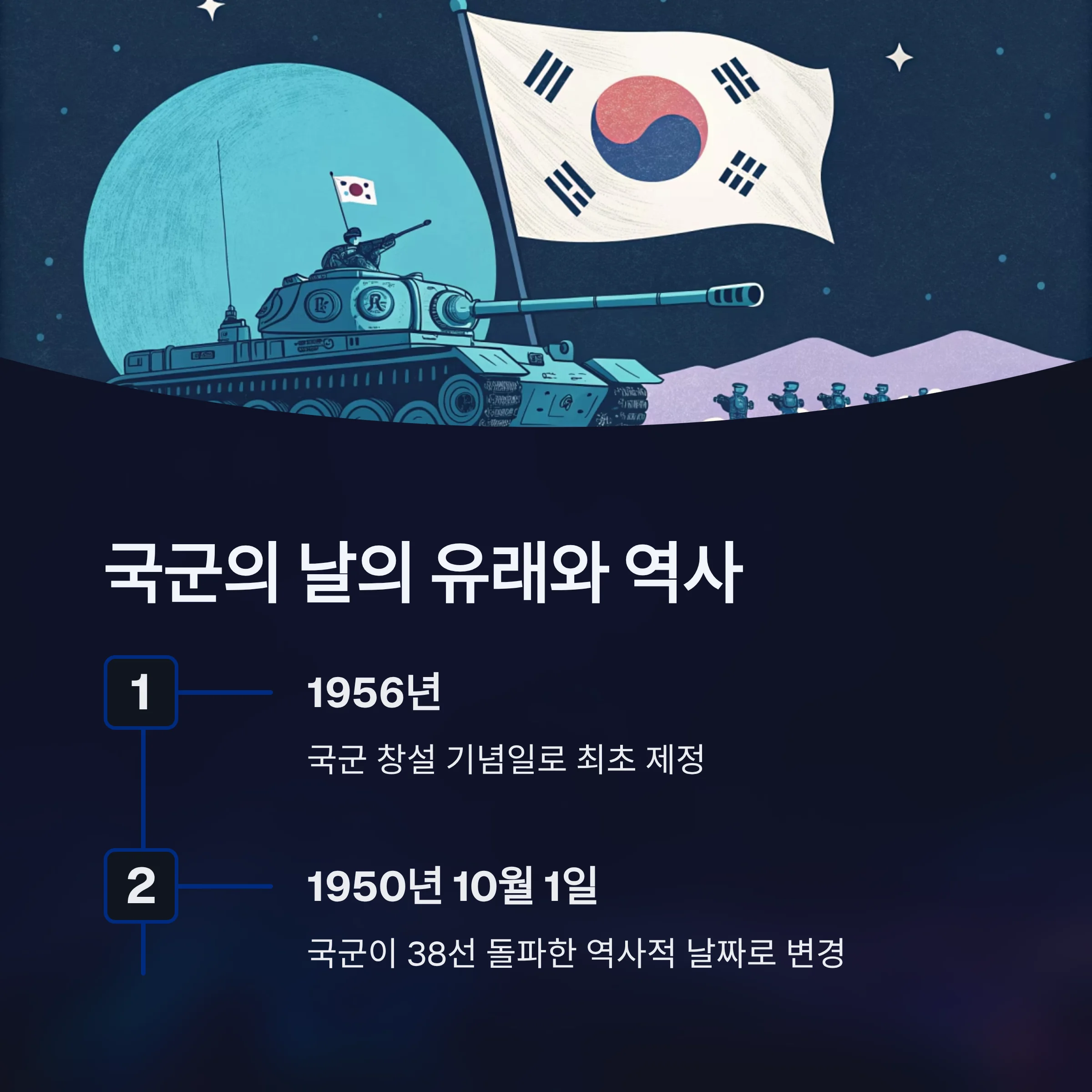 원래는 9월 중순에 기념되었으나, 1950년 10월 1일 국군이 38선을 돌파한 날을 기념해 현재의 날짜로 변경되었습니다.