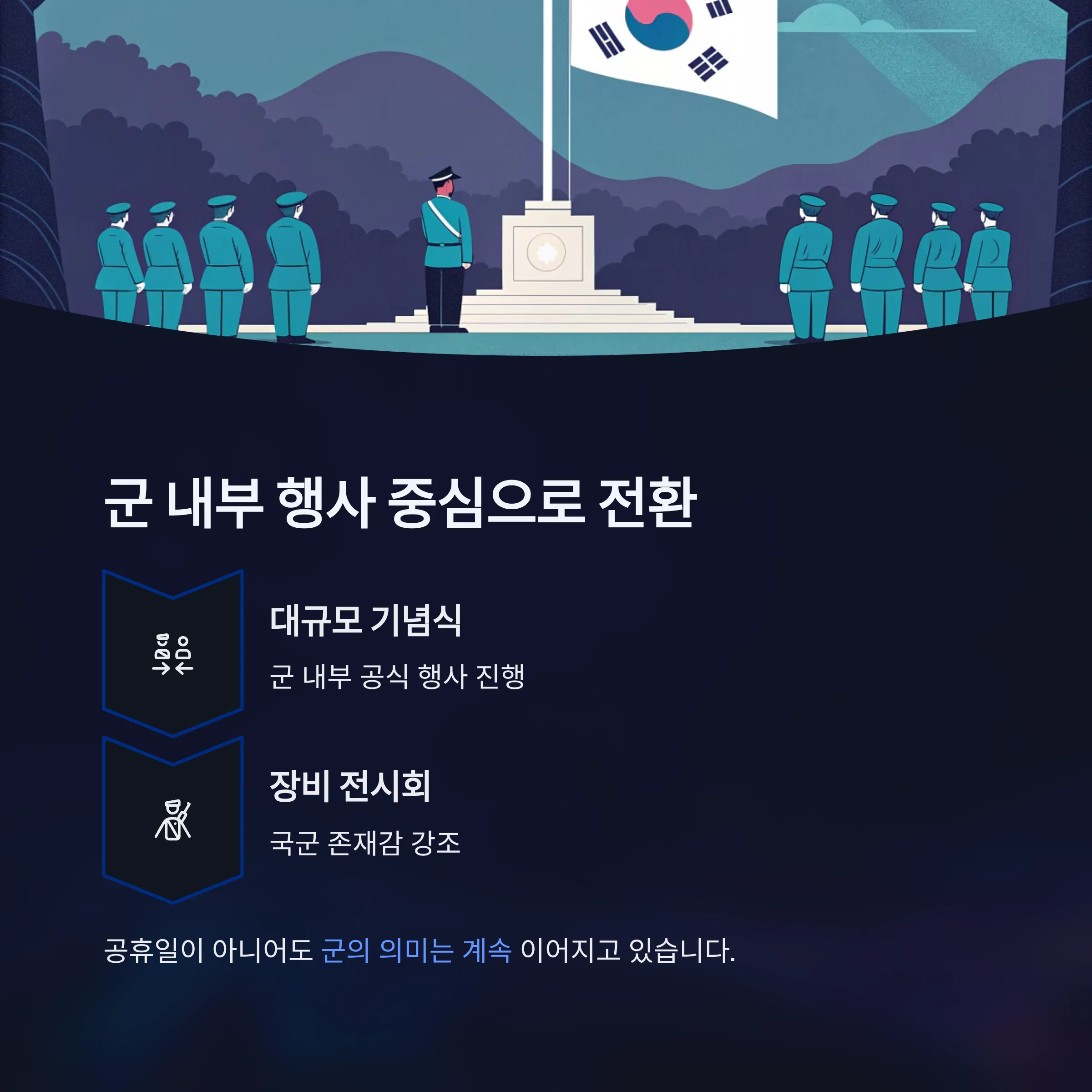 국군의 날은 공휴일에서 제외되었으나 그 의미가 사라진 것은 아닙니다.