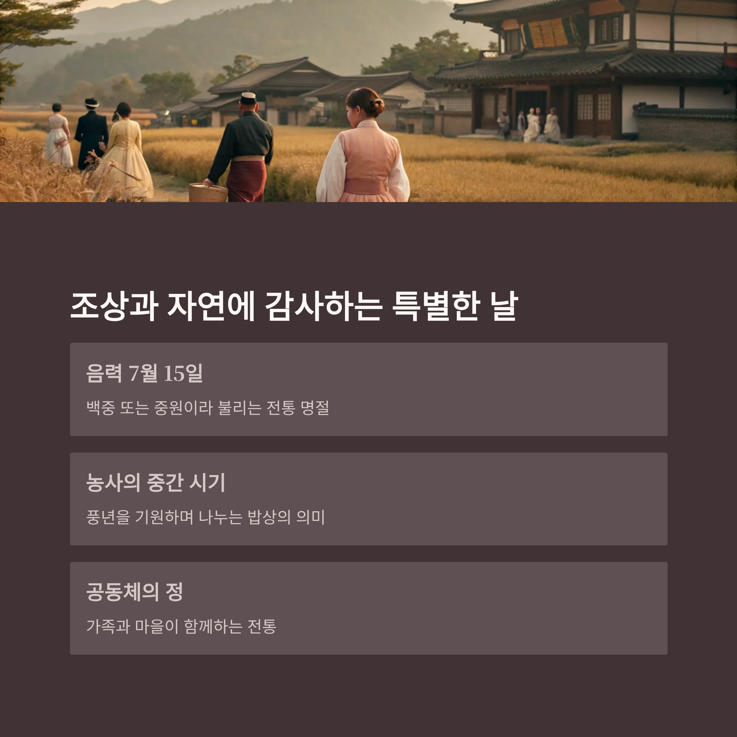 백중은 단순한 명절이 아니라, 사람과 자연이 조화를 이루는 시기입니다.