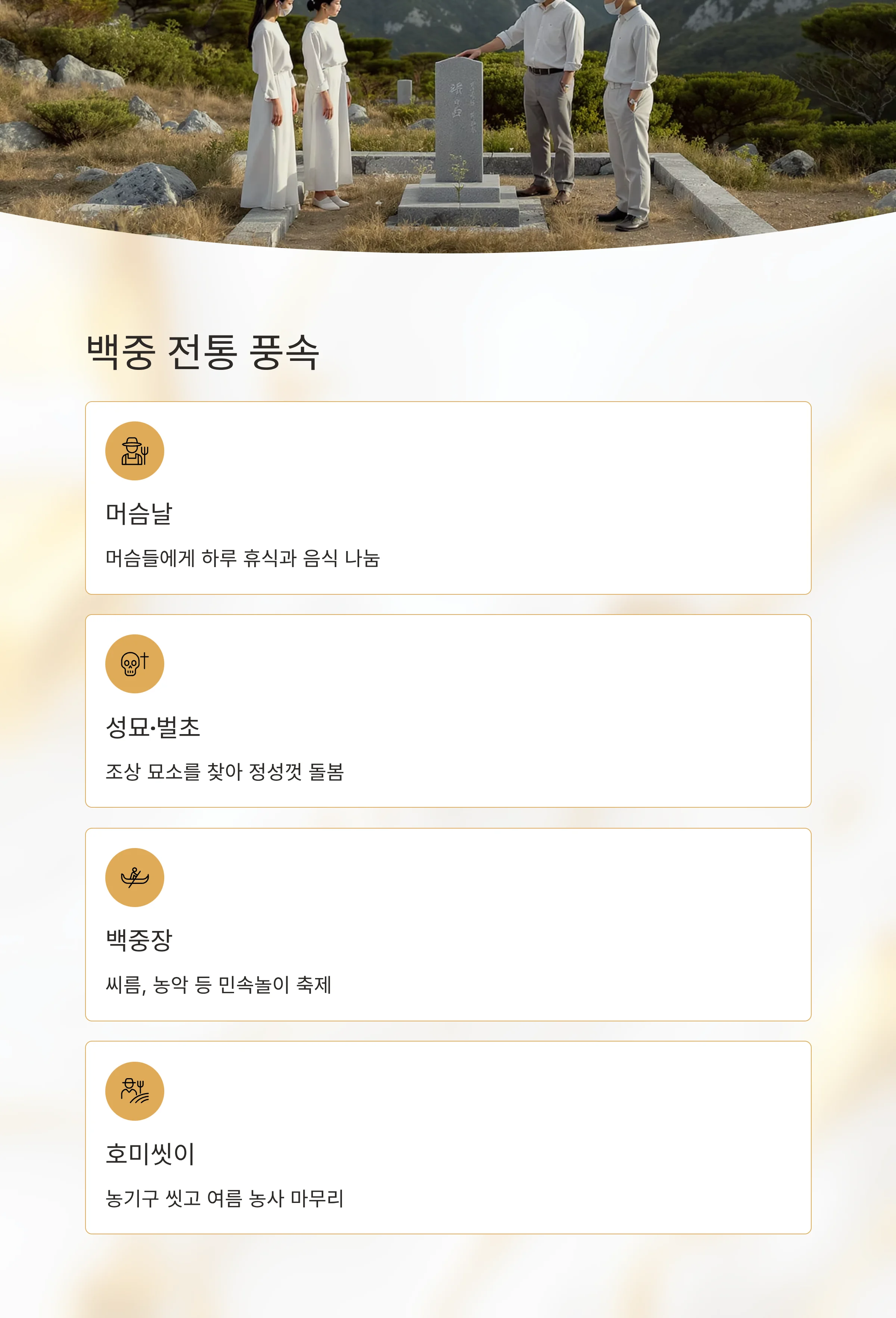 - 백중장 : 씨름·농악 등 민속놀이로 마을 축제