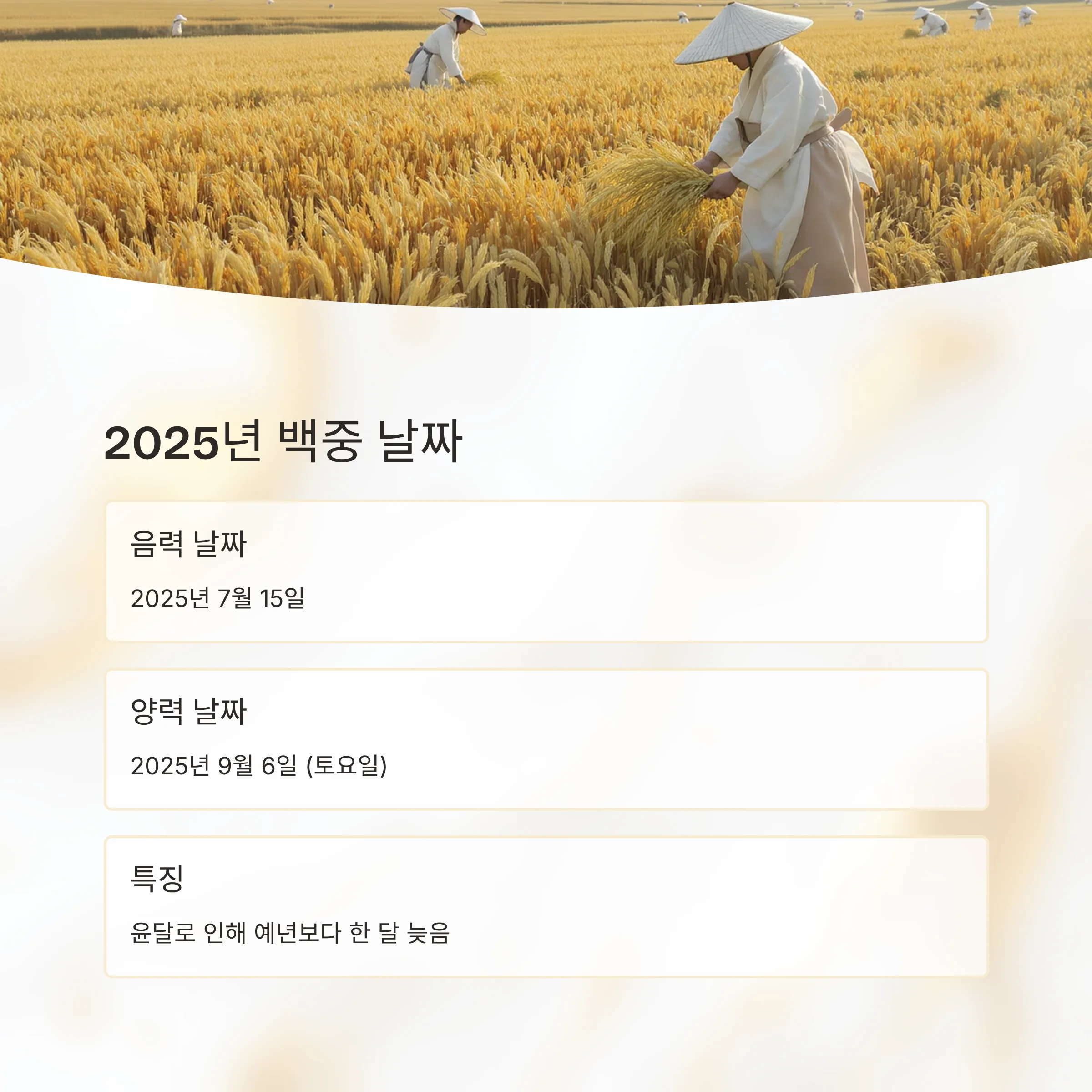 음력 기준으로 매년 7월 15일, 2025년 백중은 양력 9월 6일(토요일)입니다.