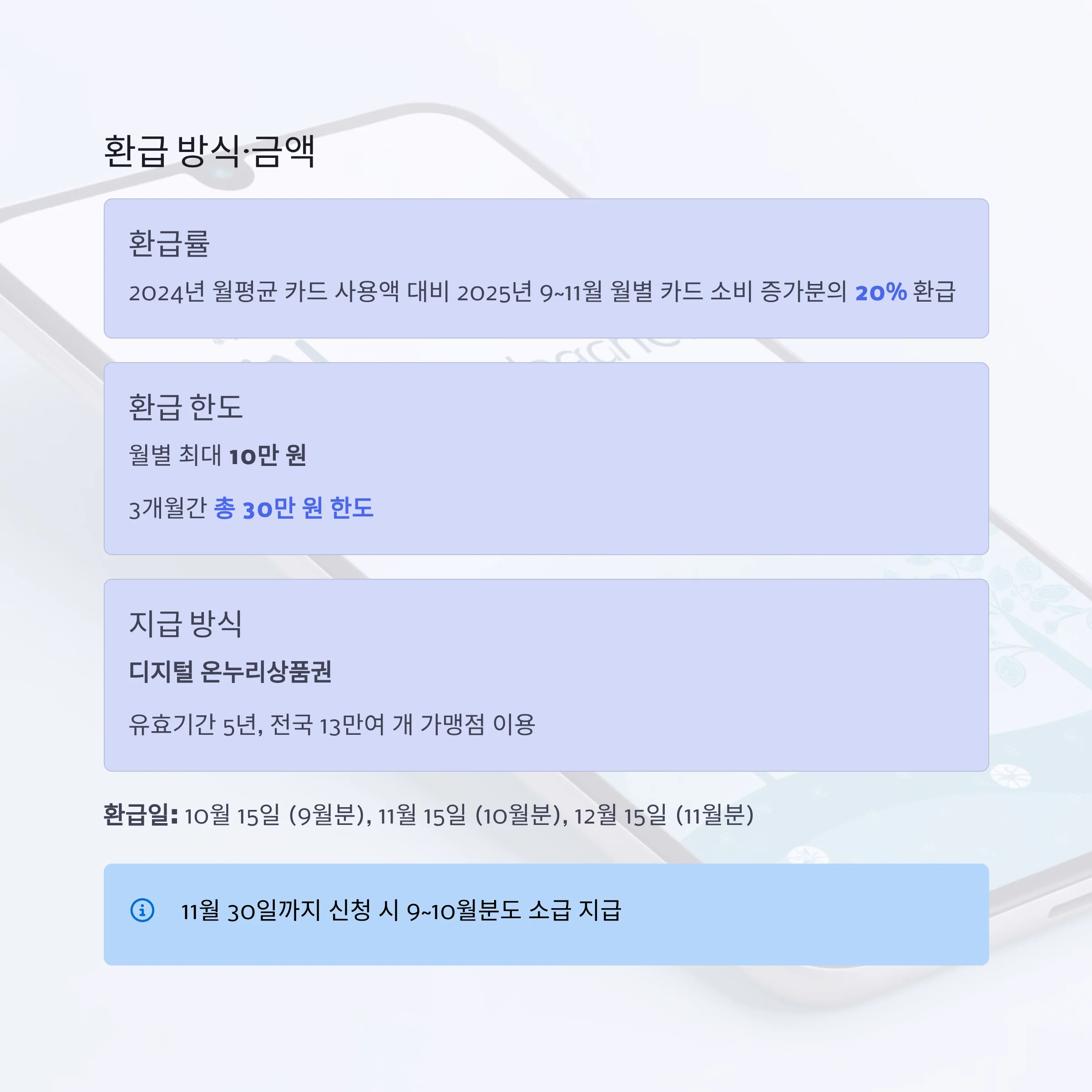 - 2024년 월평균 카드 사용액 대비 2025년 9~11월 월별 카드 소비 증가분의 20% 환급