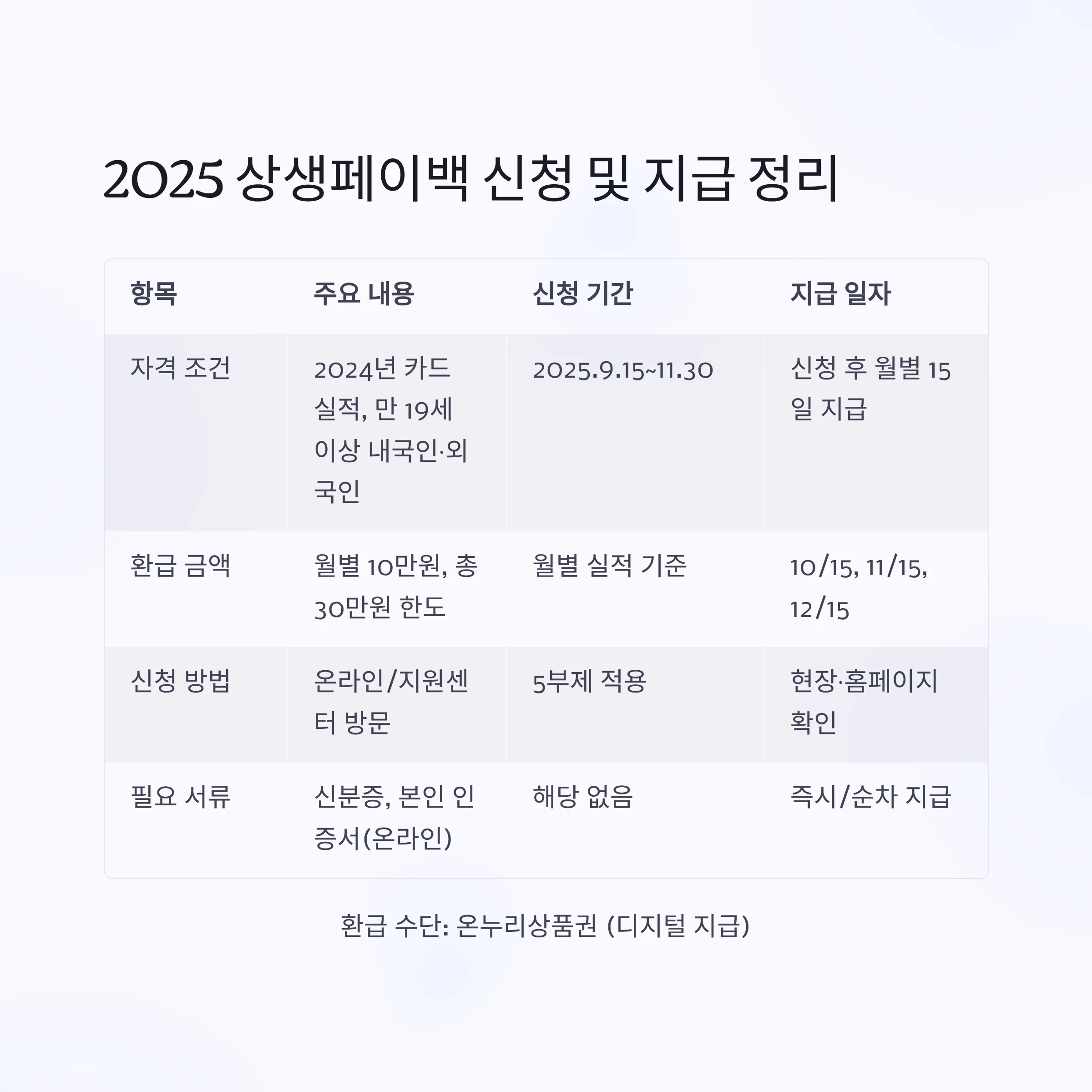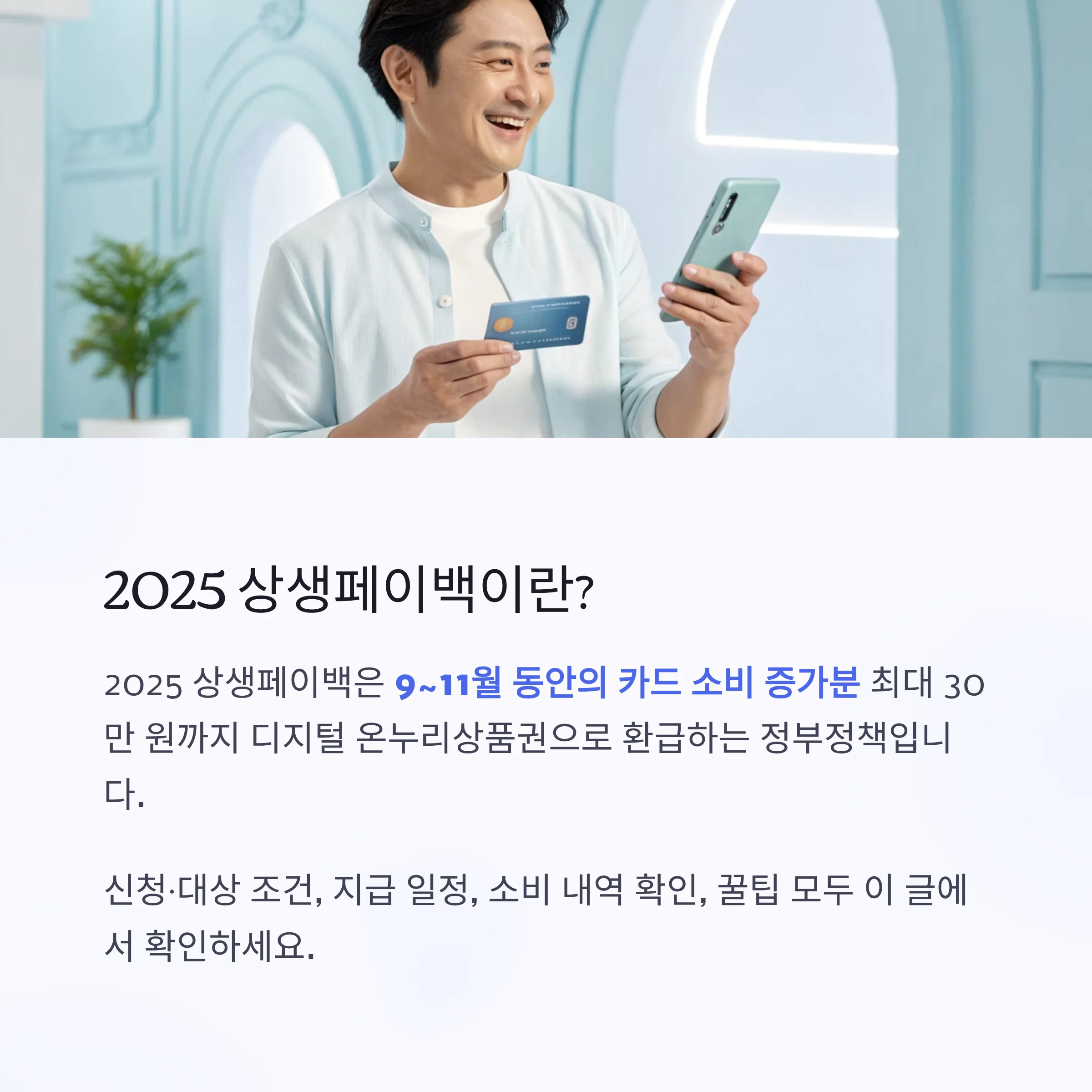 2025 상생페이백은 9~11월 동안의 전년 대비 카드 소비 증가분에 대해 최대 30만 원까지 디지털 온누리상품권으로 환급하는 정부정책입니다.