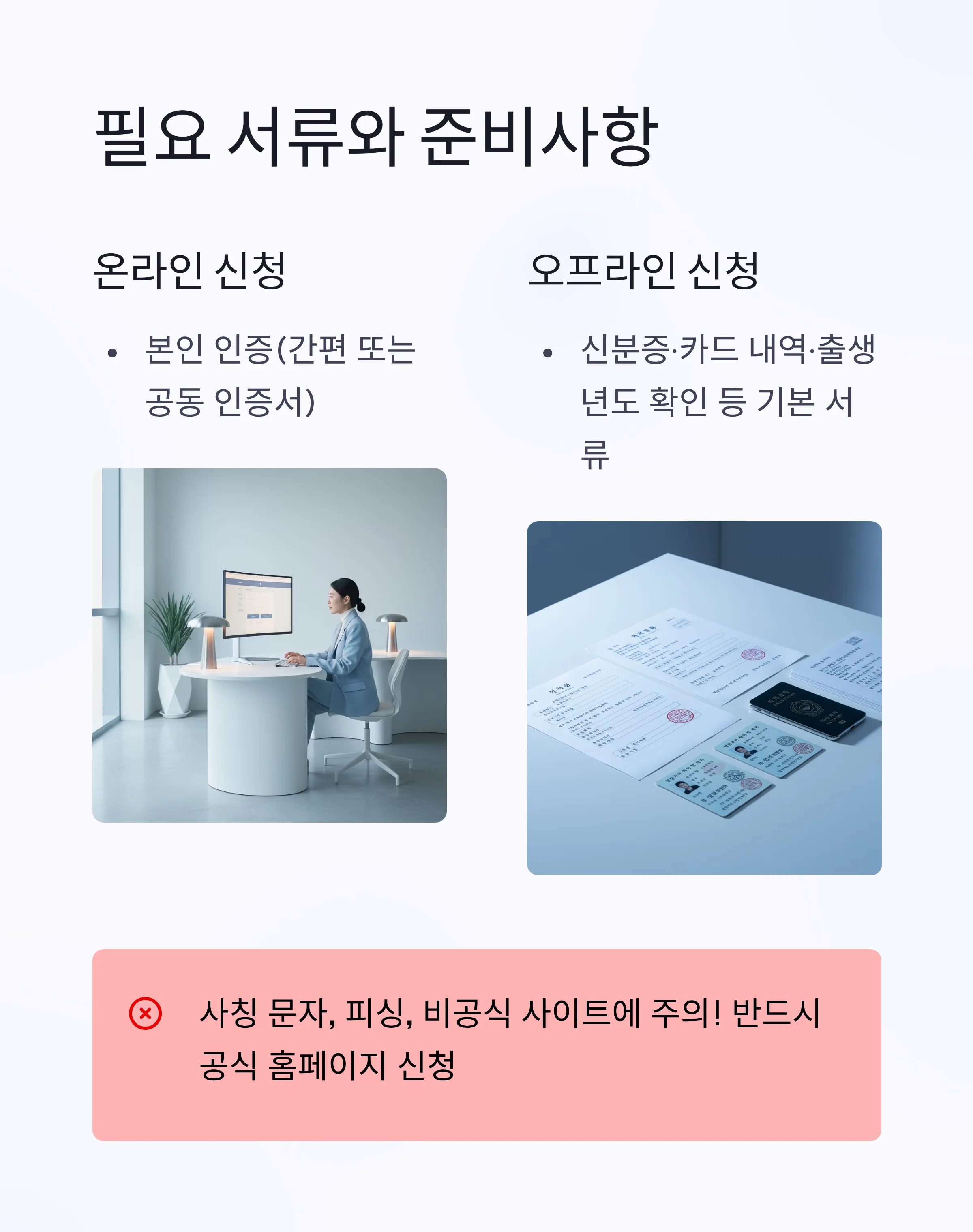 - 오프라인: 신분증·카드 내역·출생년도 확인 등 기본 서류