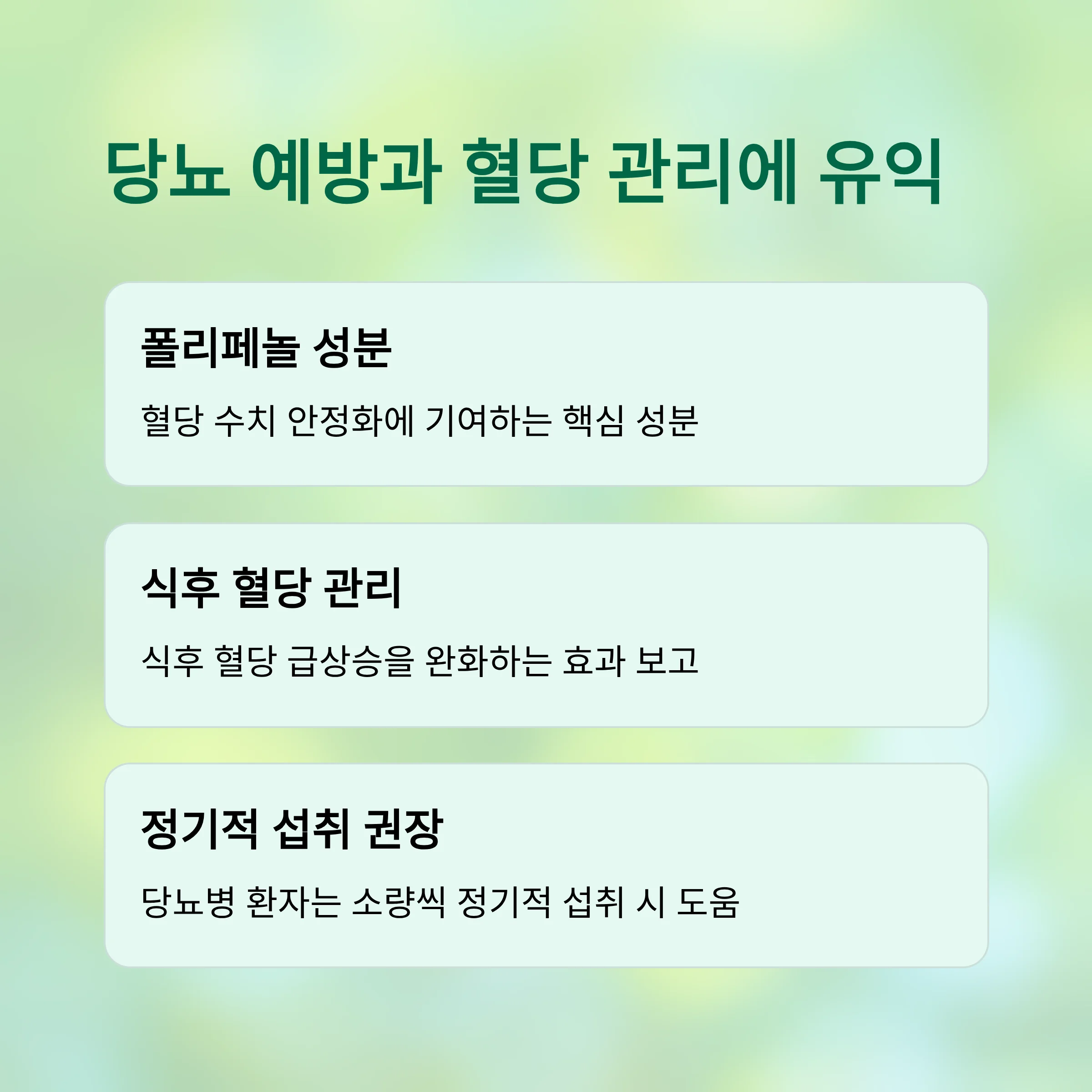 당뇨 예방이나 초기 혈당 관리에 도움을 주며, 식후 혈당 급상승을 완화하는 효과도 보고된 바 있습니다.