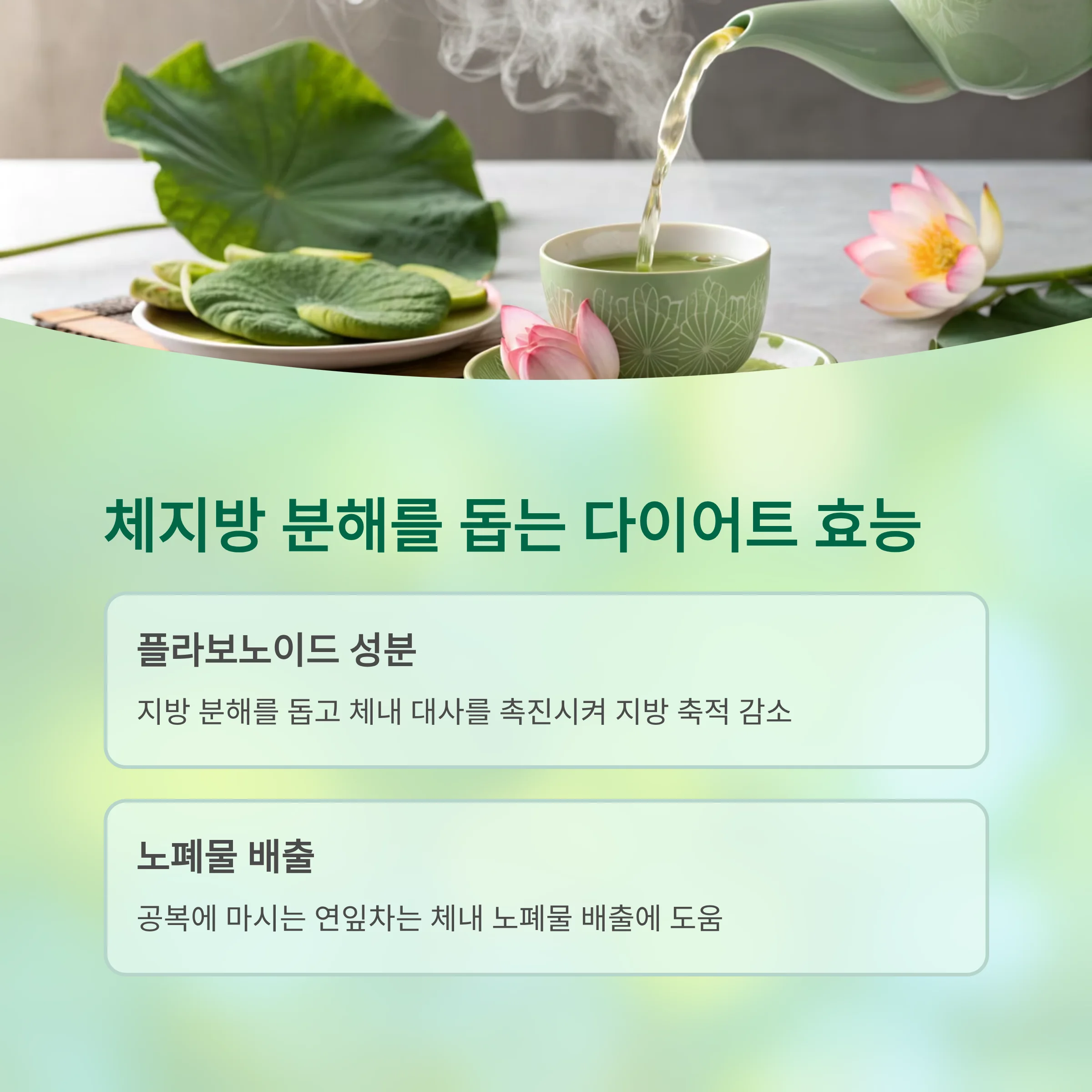 연잎에는 지방 분해를 돕는 플라보노이드 성분이 풍부하게 들어 있습니다.