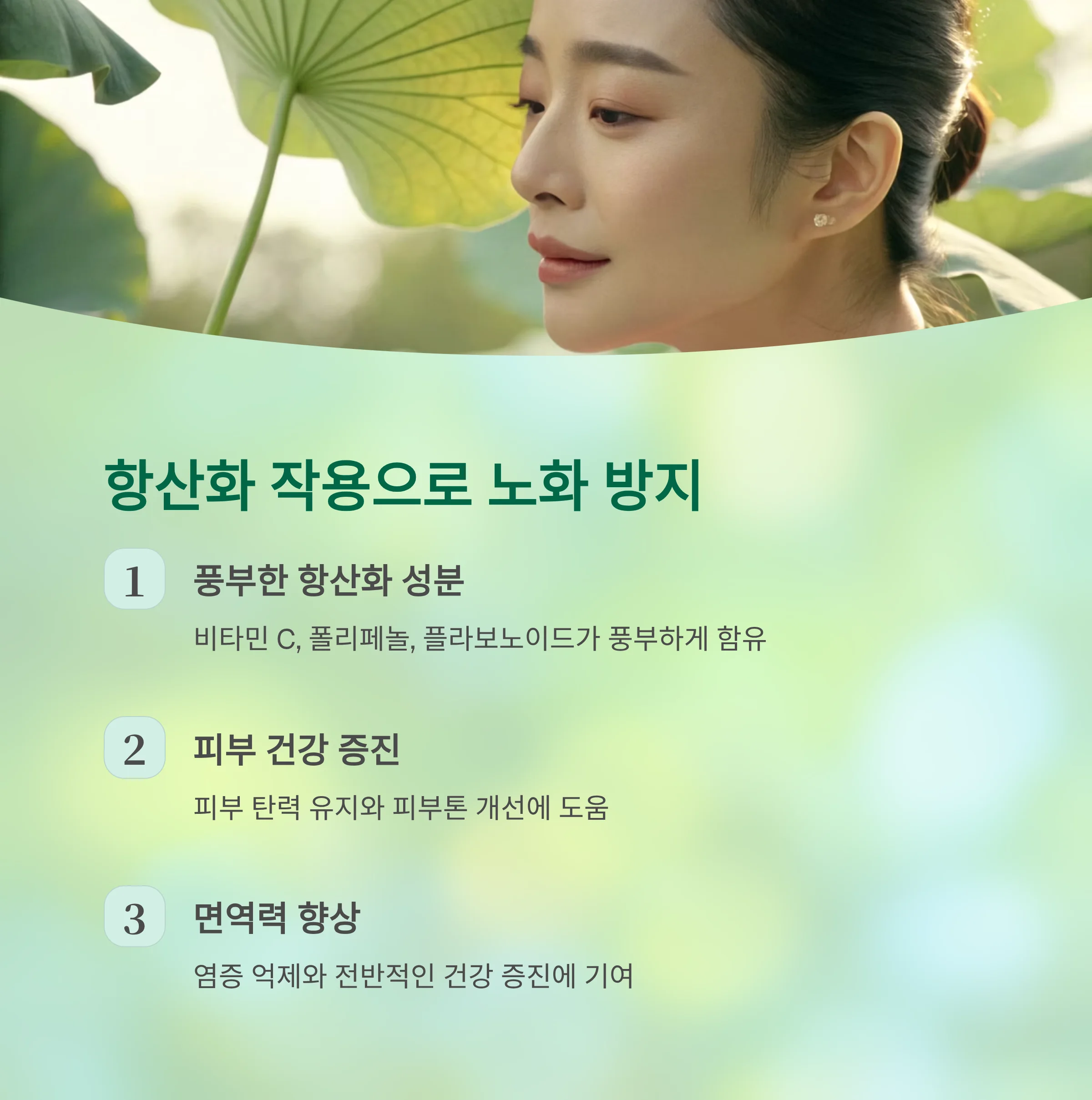 연잎은 노화 방지에 필수적인 항산화 성분이 다량 포함돼 있습니다.