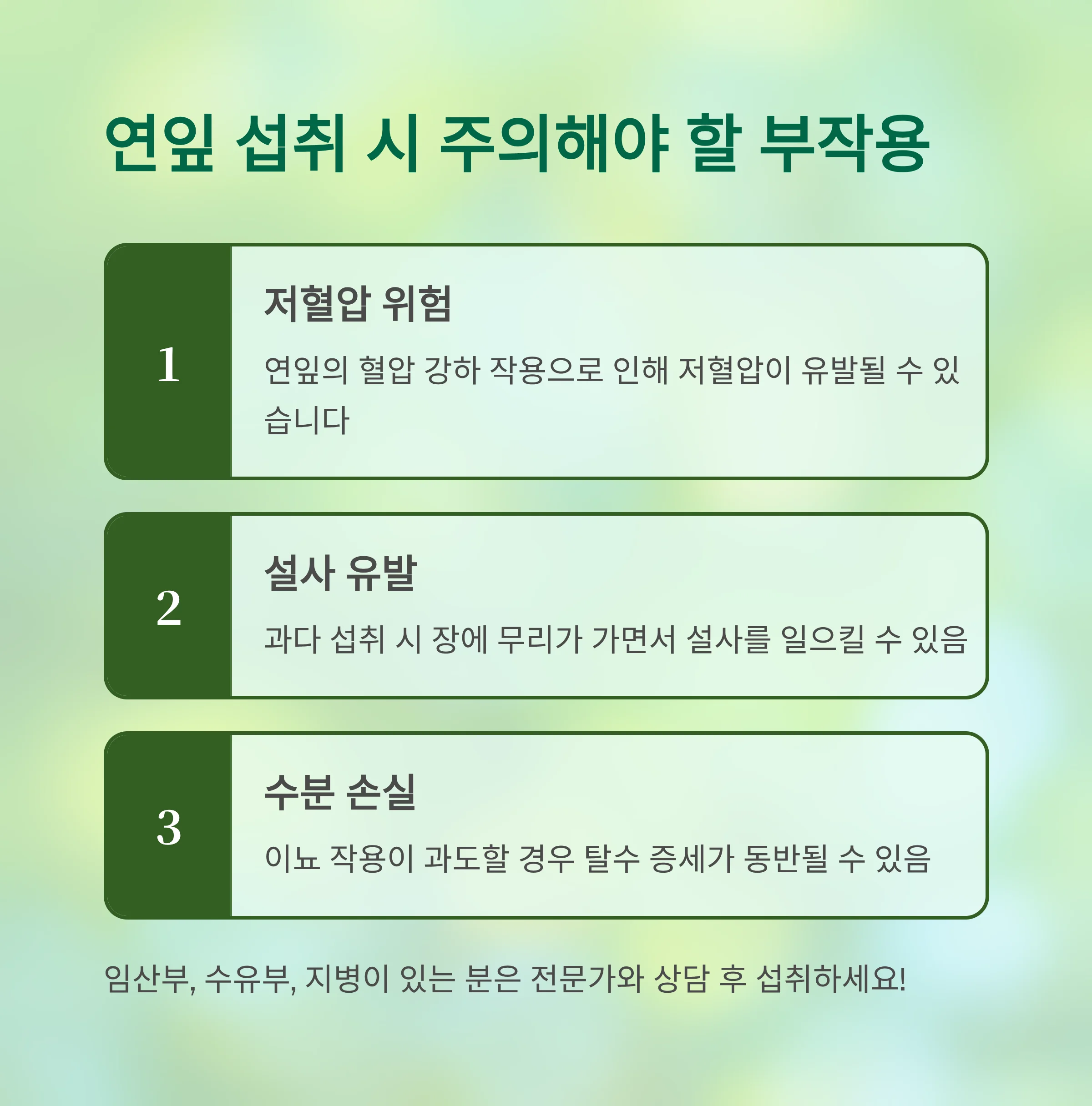 특히 임산부, 수유부, 지병이 있는 분은 전문가 상담 후 섭취가 권장됩니다.