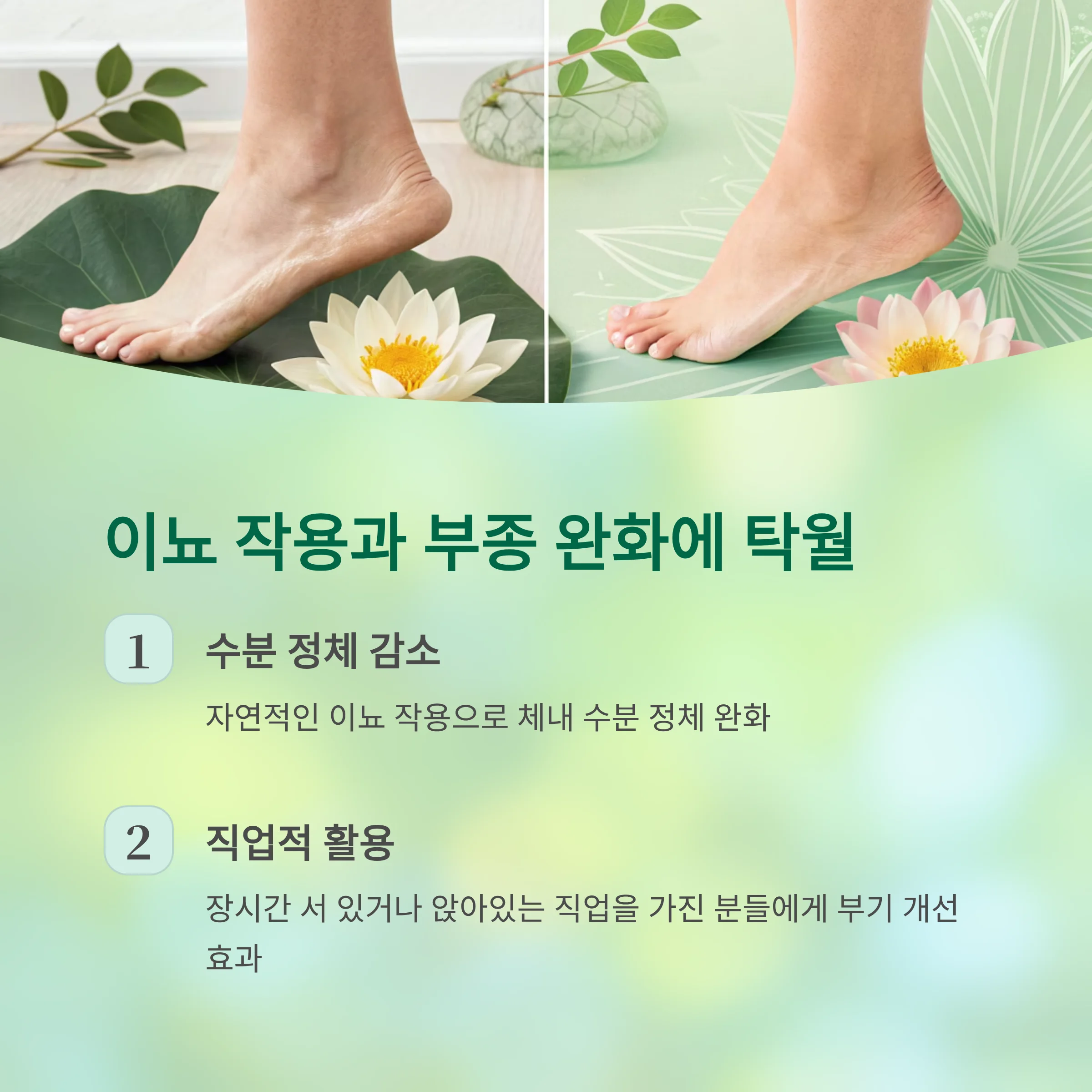 장시간 서 있거나 앉아 있는 직업을 가진 분들 사이에서 연잎차 섭취가 부기 개선에 도움이 된다는 경험담도 많습니다.