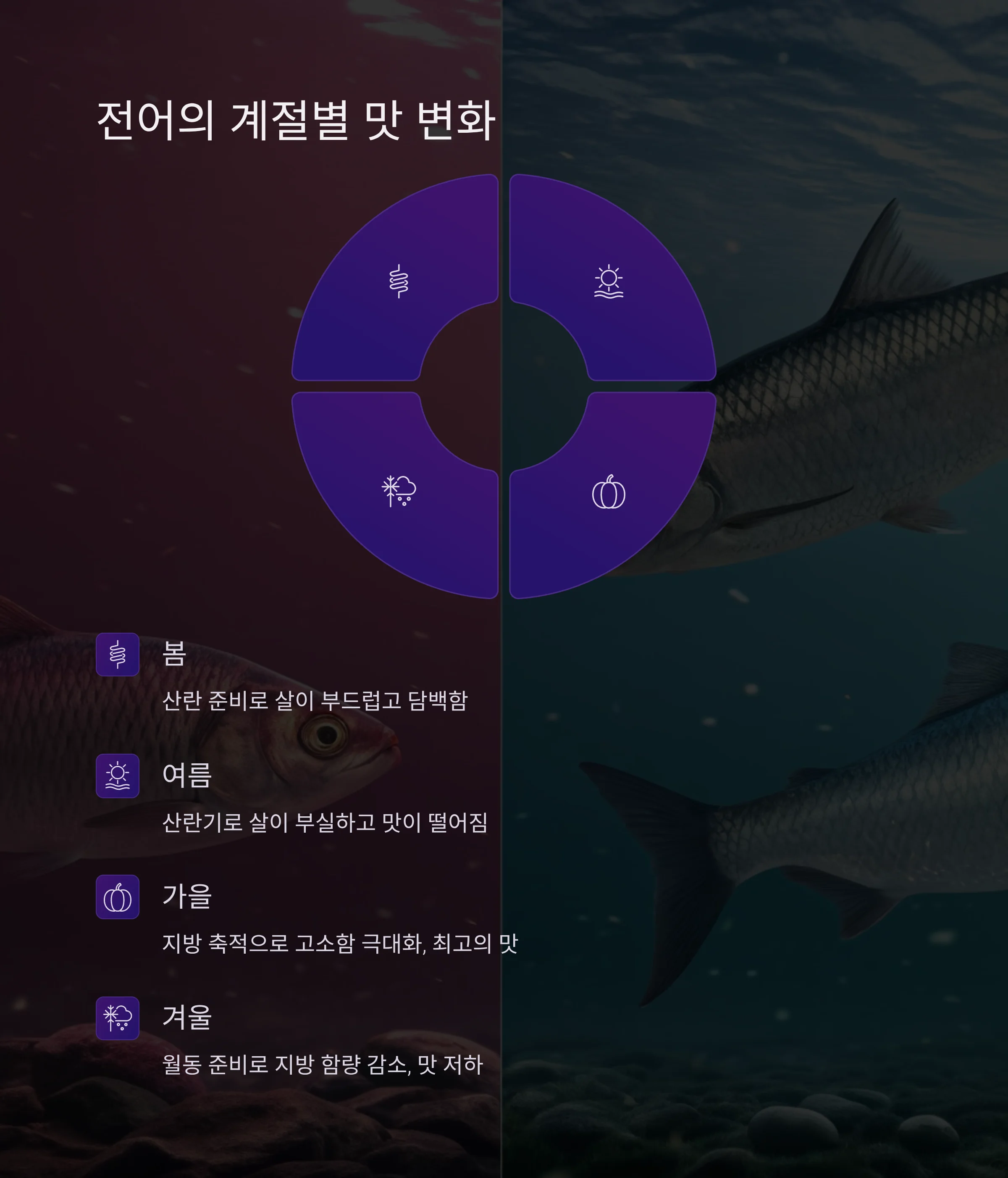 지방 함량은 여름보다 가을이 2배 이상 높아져 입안에서 녹는 듯한 식감을 자랑합니다.