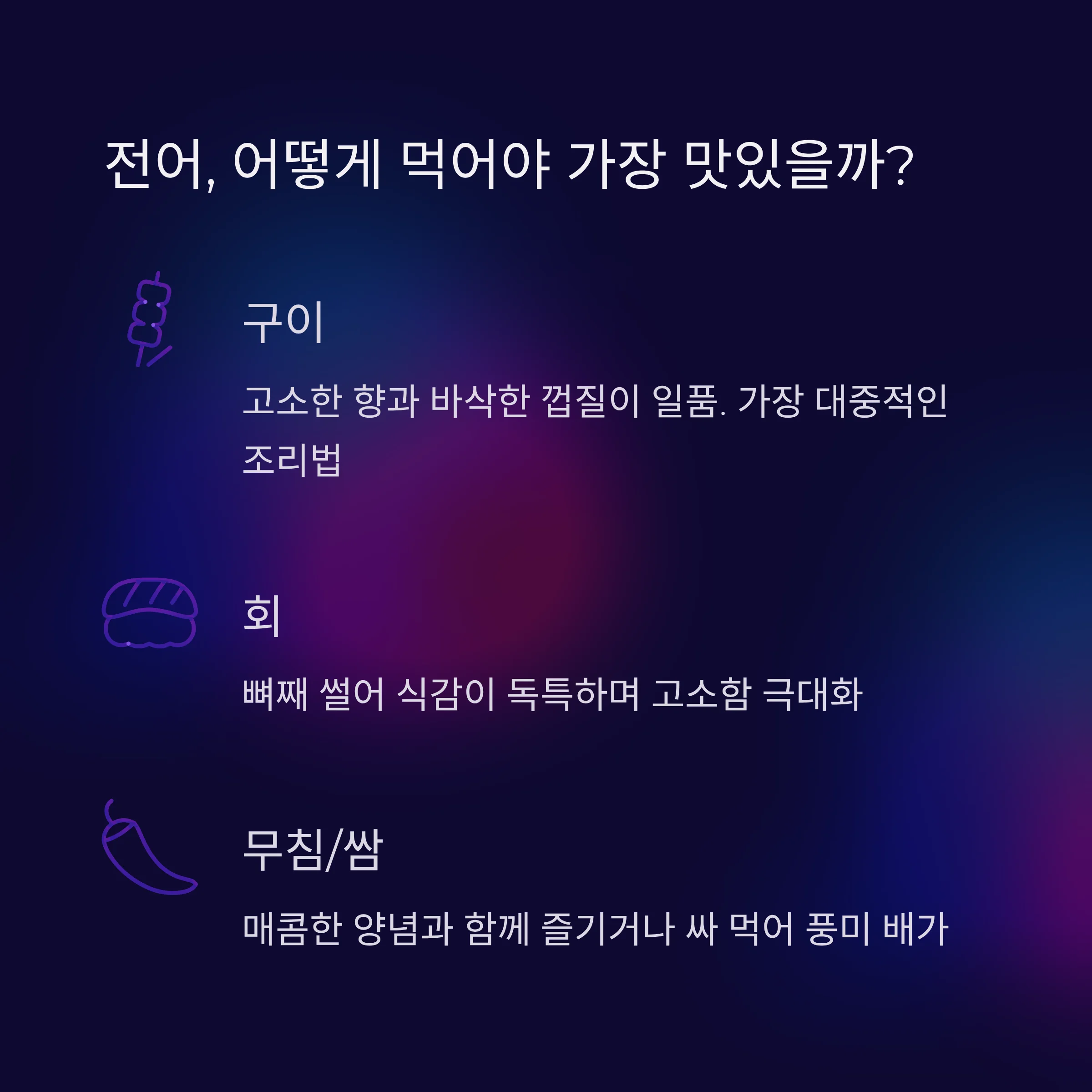 전어는 구이로 가장 많이 즐기지만, 회, 무침, 전어쌈 등 다양한 조리법이 있습니다.