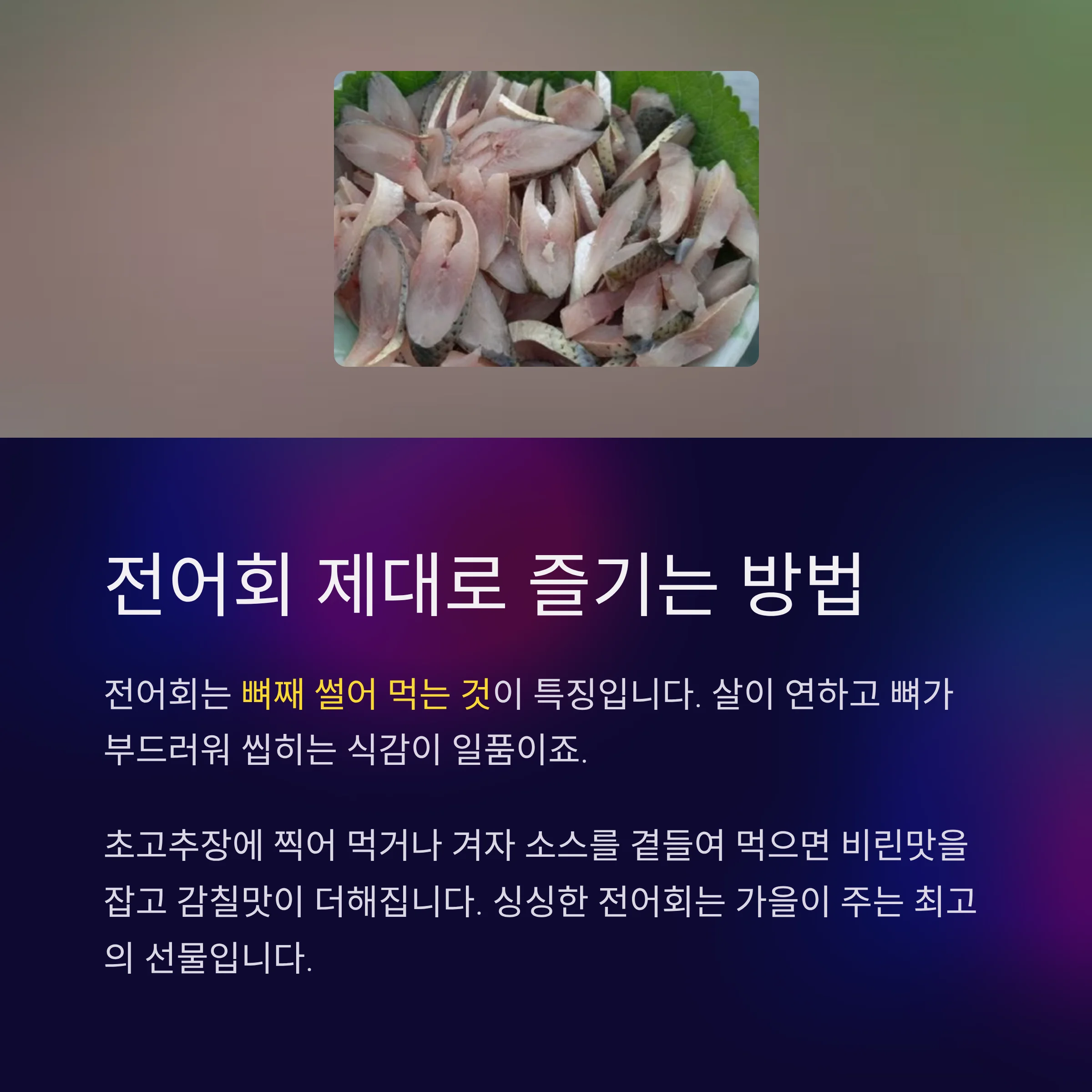 최근에는 해수 온도 상승과 전어 금어기의 영향으로 8월 중순~9월 초 ‘여름 전어’도 맛이 좋아 화제가 되고 있습니다.