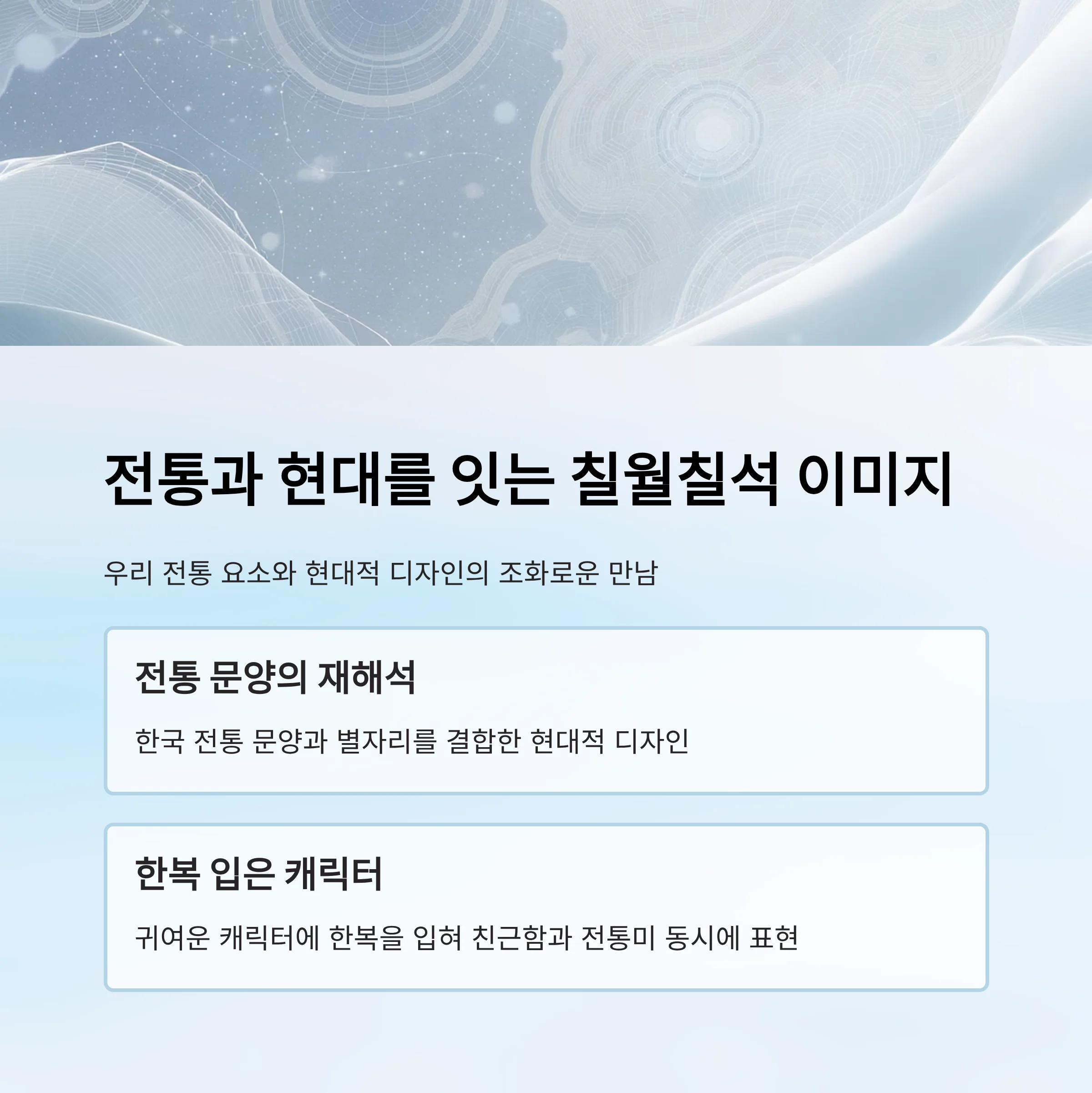 한복을 입은 캐릭터나 전통 문양과 별자리가 함께 있는 이미지도 칠월칠석의 전통적인 정취를 살리면서 현대적인 감성도 함께 담을 수 있어요.