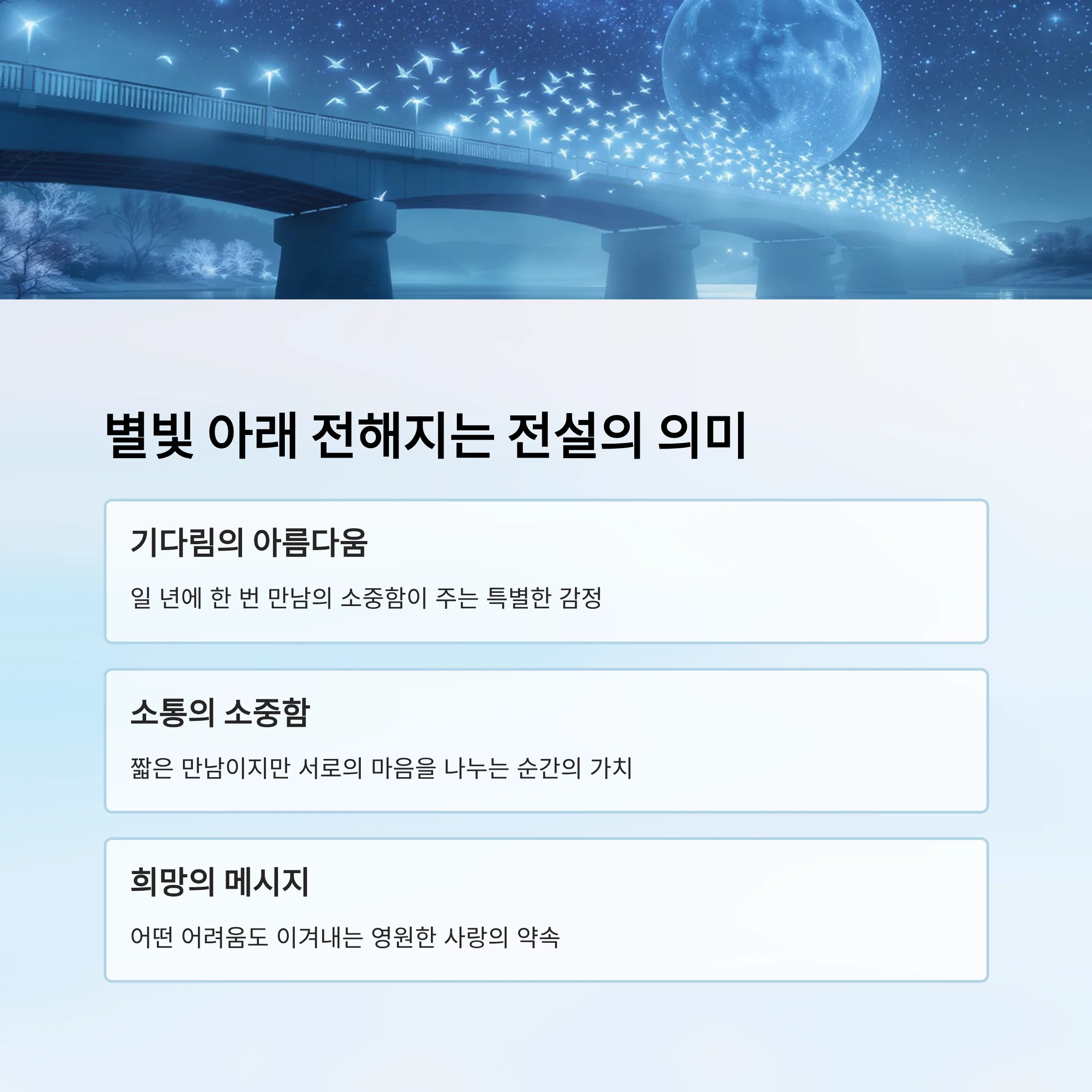 이 전설은 단순한 로맨스를 넘어서 "기다림의 가치"와 "소통의 소중함"을 상징하죠.