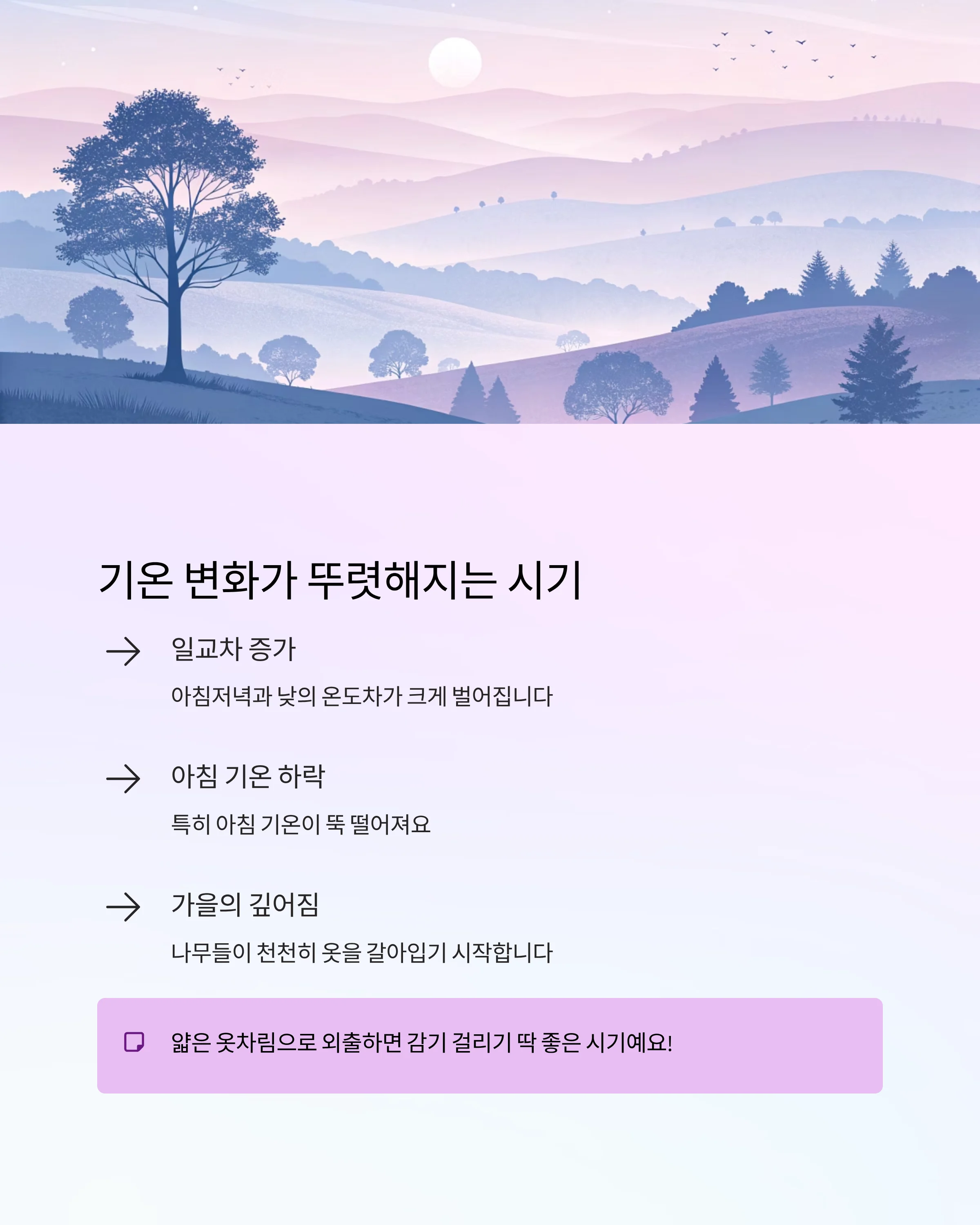한로에 접어들면 일교차가 크게 벌어지며, 특히 아침 기온은 뚝 떨어지죠.