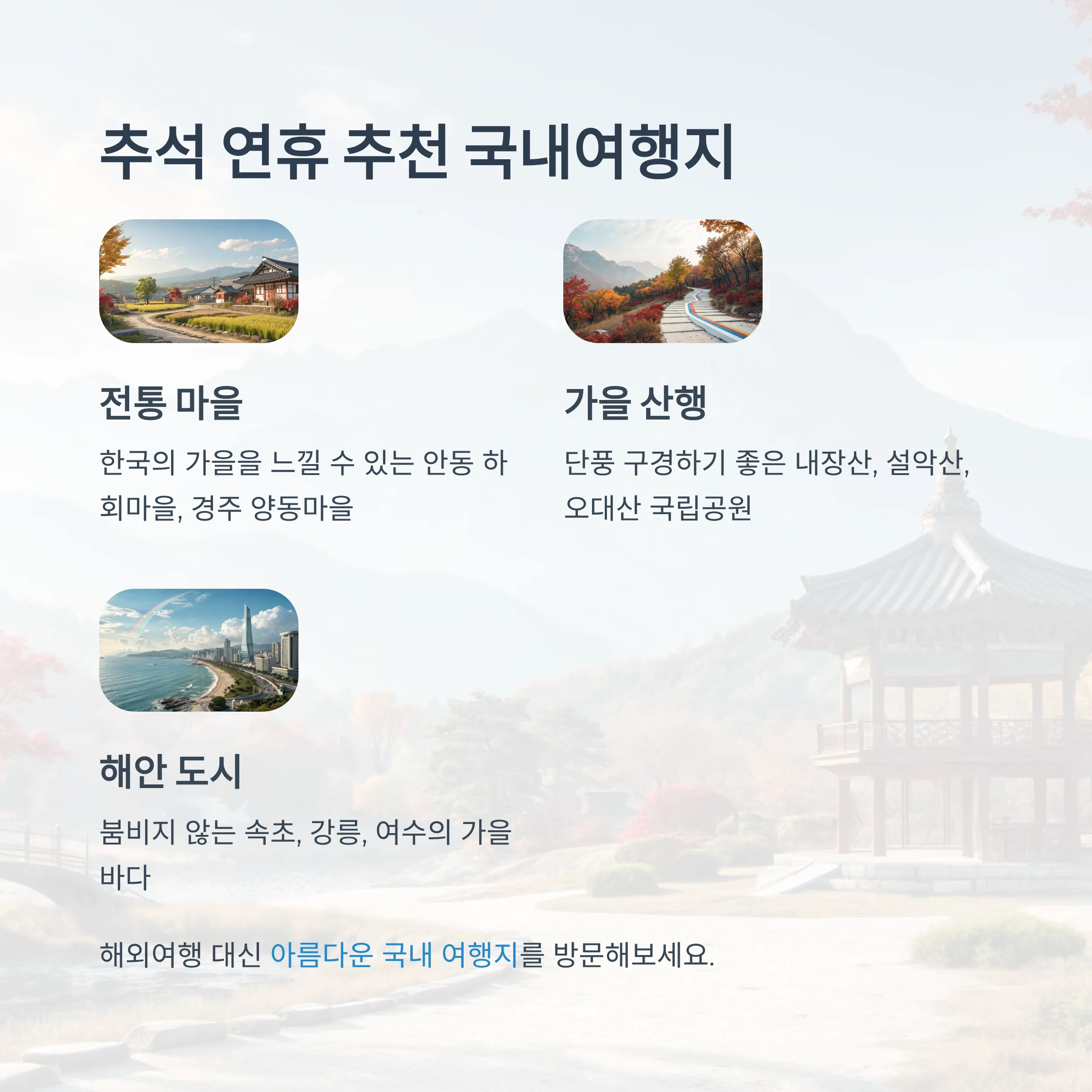 - 10월 4일(토)~8일(수) 주말 + 추석 연휴 + 대체공휴일