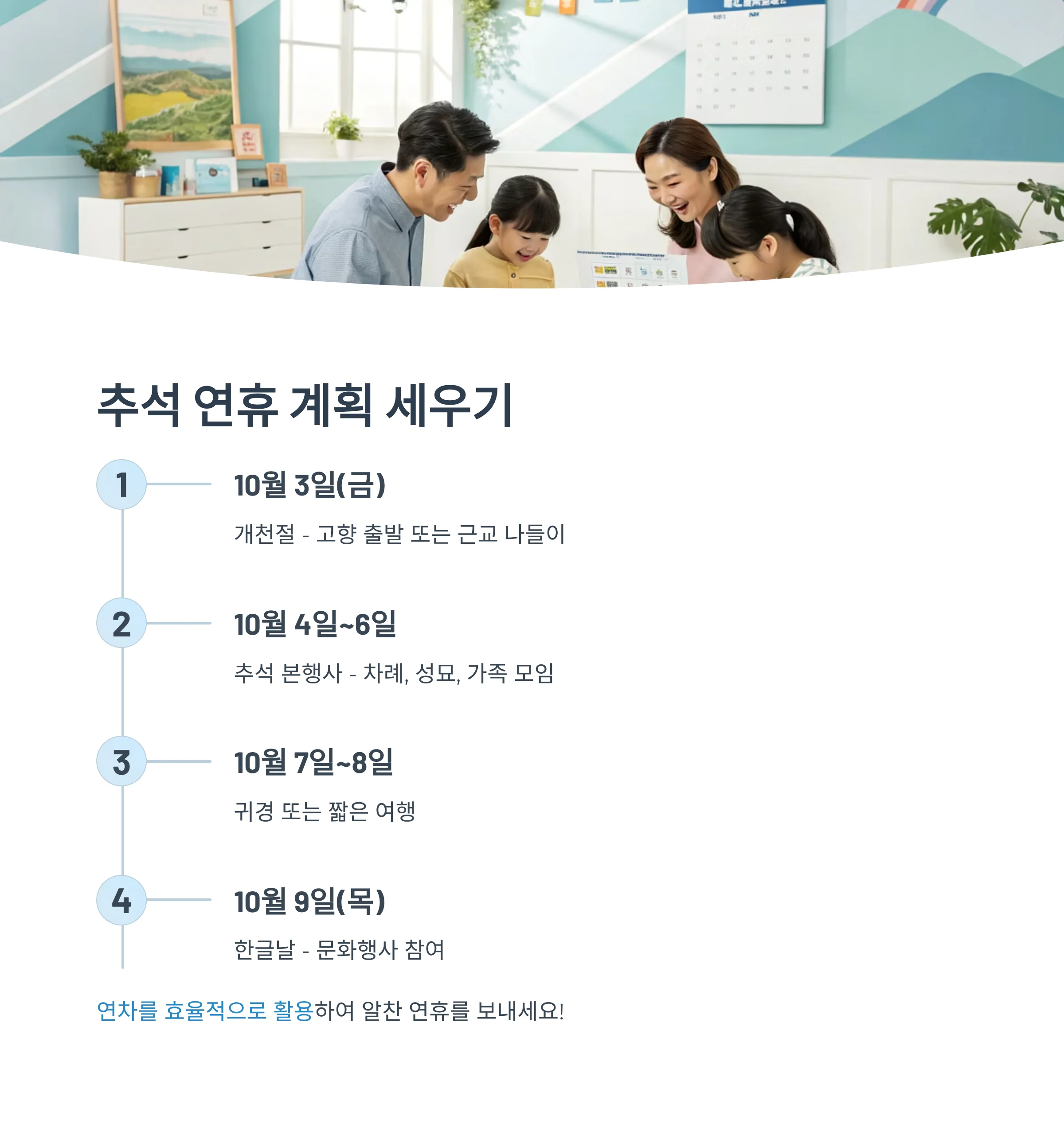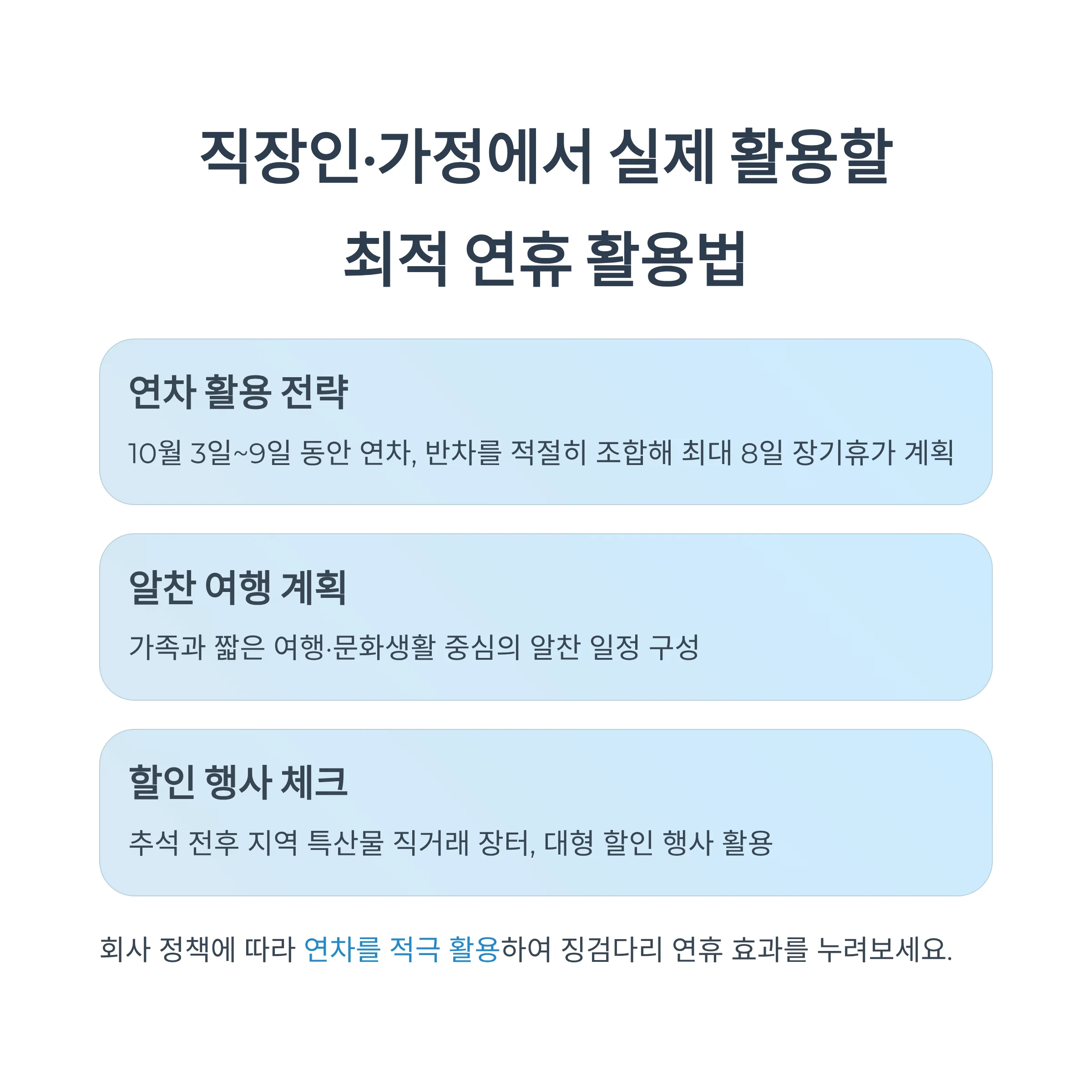 10월 초 (3일~9일) 동안 연차, 반차를 적절히 조합해 최대 8일의 장기휴가를 계획하거나, 가족과 짧은 여행·문화생활 중심의 알찬 일정을 만들어보세요.
