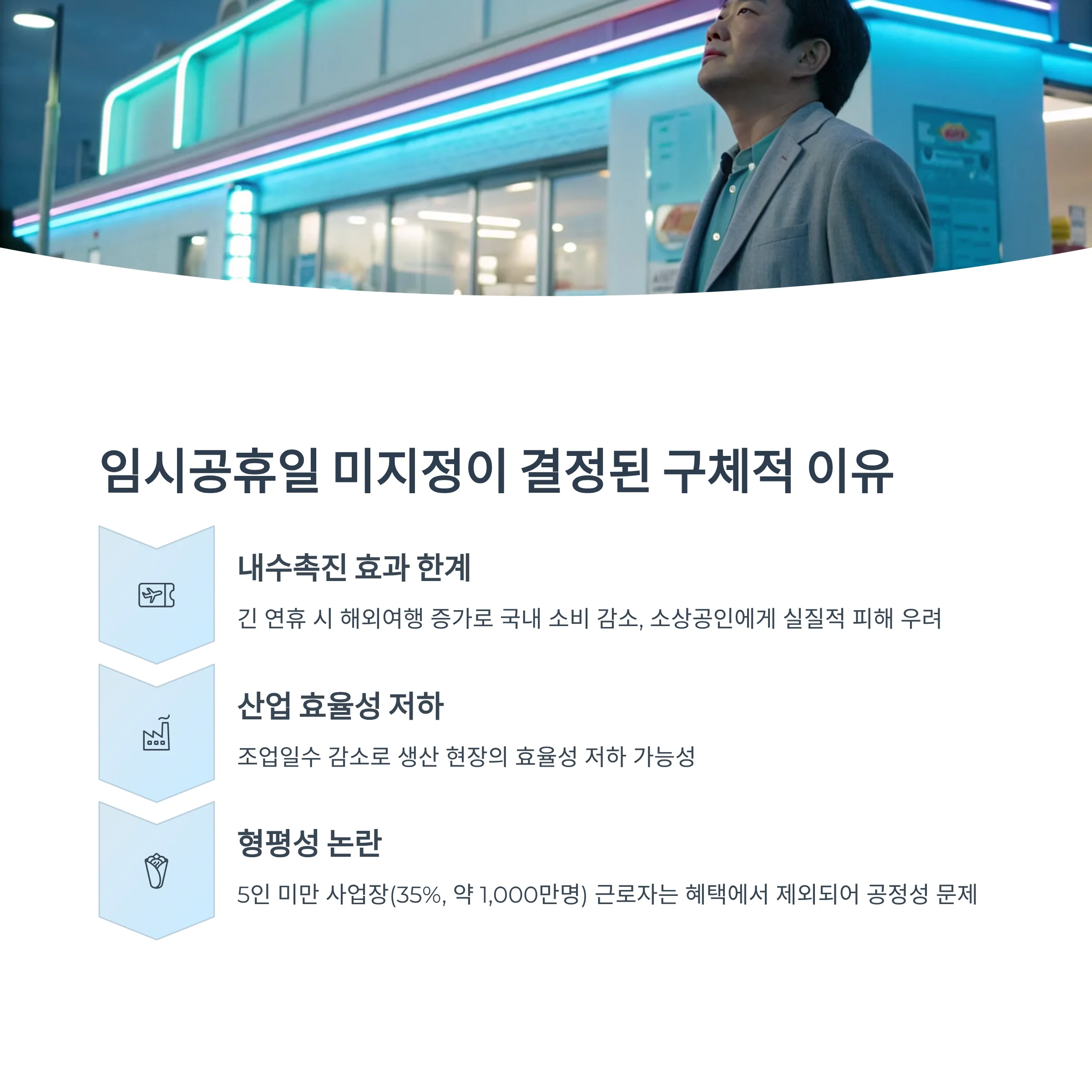 셋째, 임시공휴일 혜택을 받지 못하는 근로자(5인 미만 사업장 35%, 약 1,000만 명)가 많아 공정성 논란도 큰 이슈였습니다.
