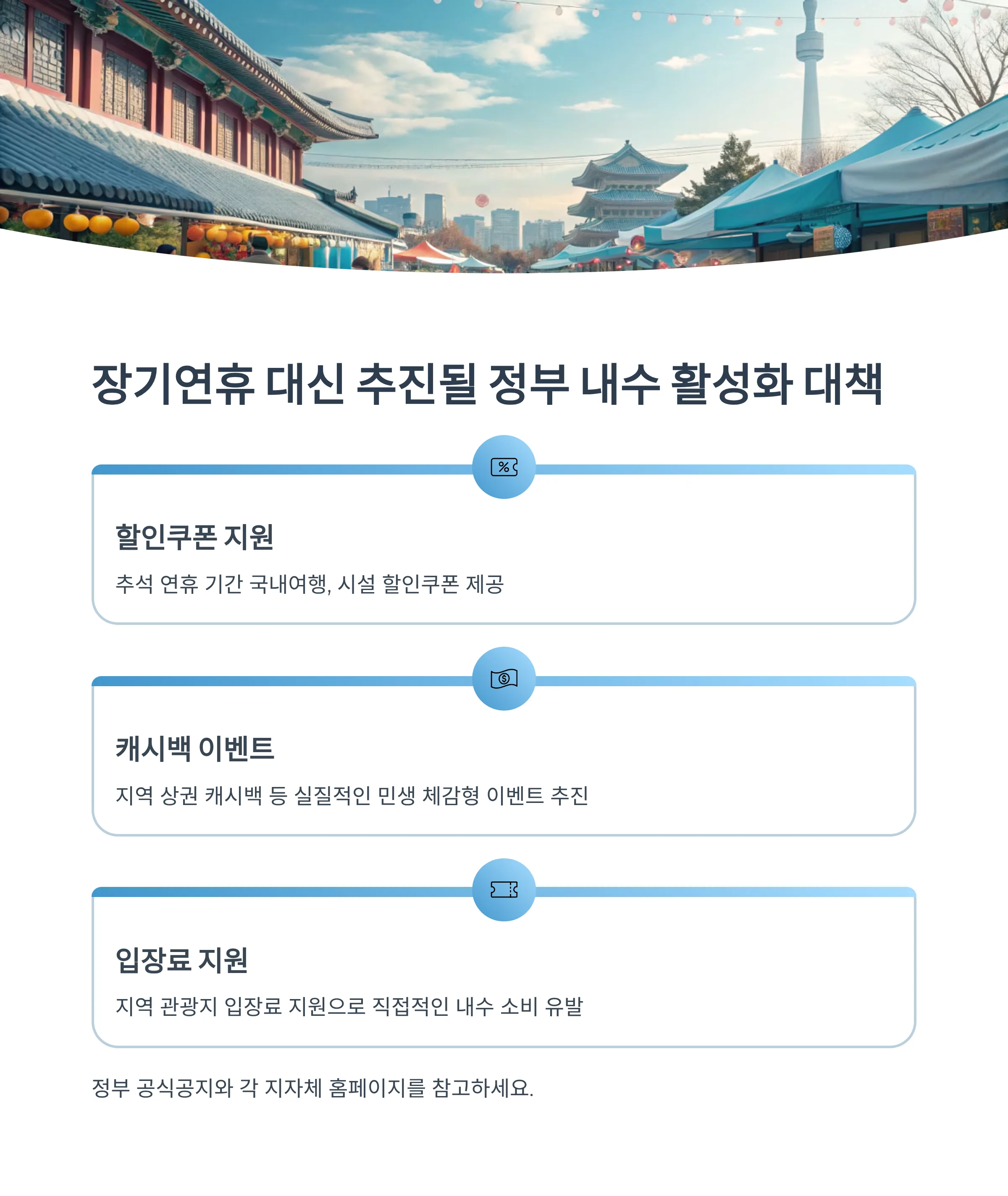 대표적으로 추석 연휴 기간 국내여행, 시설 할인쿠폰, 문화·레저 할인, 지역 상권 캐시백 등 실질적인 민생 체감형 이벤트가 추진됩니다.