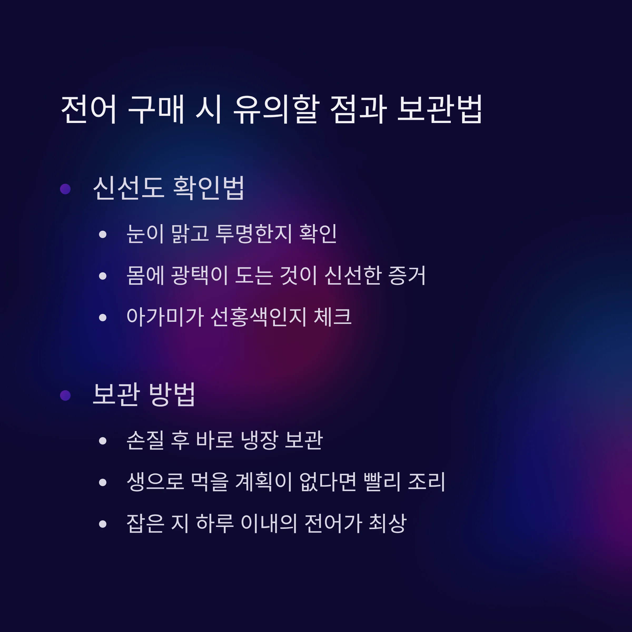 눈이 맑고 몸에 광택이 도는지 확인하고, 손질 후 바로 냉장 보관하거나 생으로 드시지 않을 경우에는 구이용으로 바로 조리하는 것이 좋습니다.